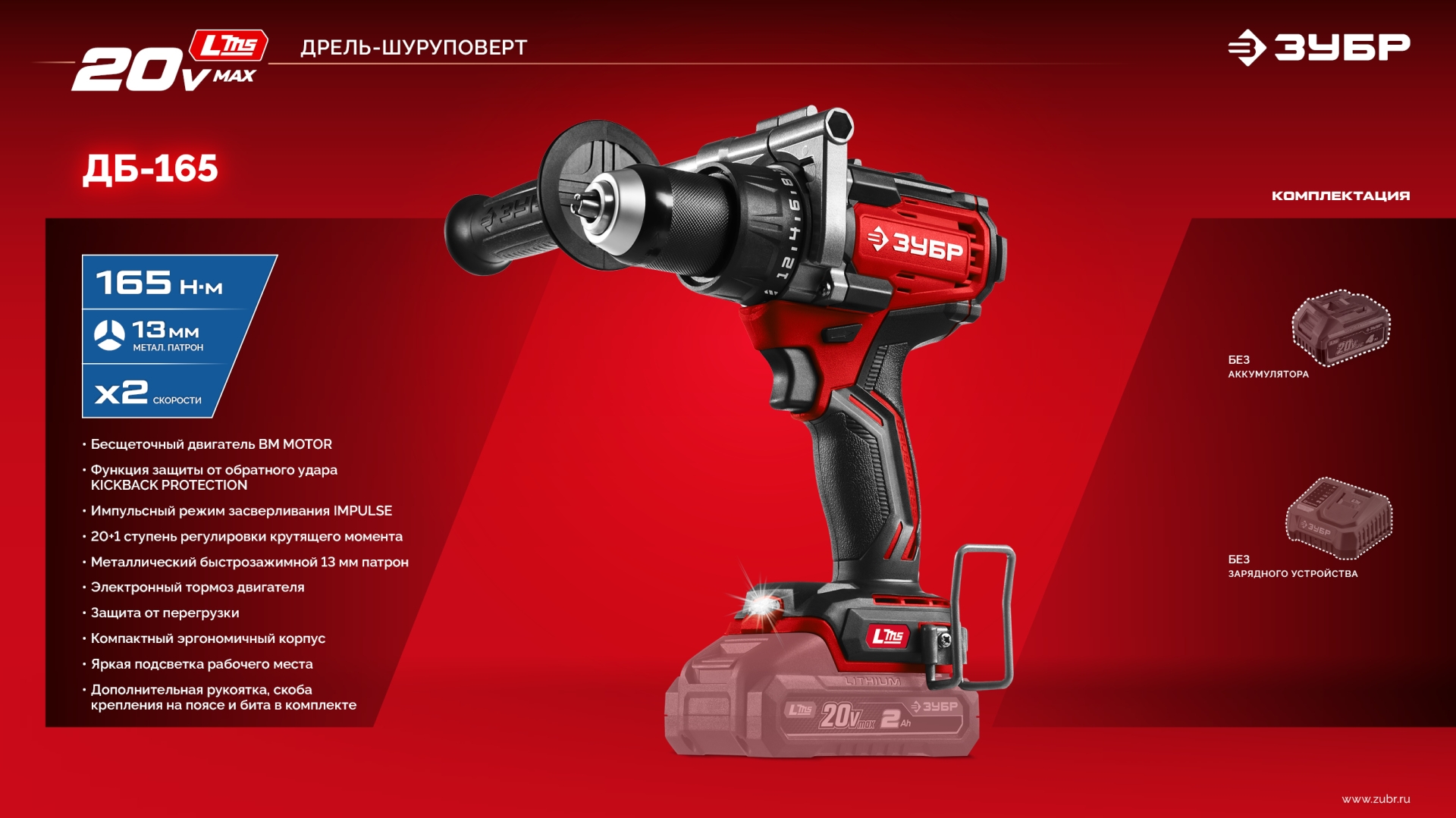 Бесщеточная дрель-шуруповерт ЗУБР системы LMS с максимальным крутящим моментом 165 Нм предназначена для работы с самым крупным крепежом (саморезы до 12 мм диаметром) и сверления отверстий до 40 мм в дереве. Встроенная защита от обратного удара предотвращает повреждение кисти при резкой блокировке вала