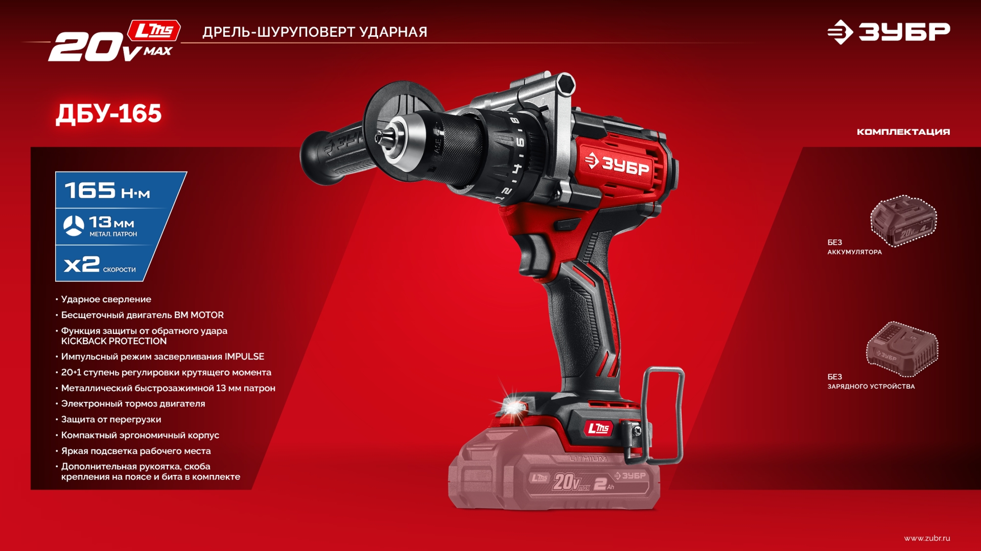 Бесщеточная ударная дрель-шуруповерт ЗУБР системы LMS с максимальным крутящим моментом 165 Нм предназначена для работы с самым крупным крепежом (саморезы до 12 мм диаметром) и сверления отверстий до 40 мм в дереве. Встроенная защита от обратного удара предотвращает повреждение кисти при резкой блокировке вала. Расширенная функциональность за счет ударного режима работы
