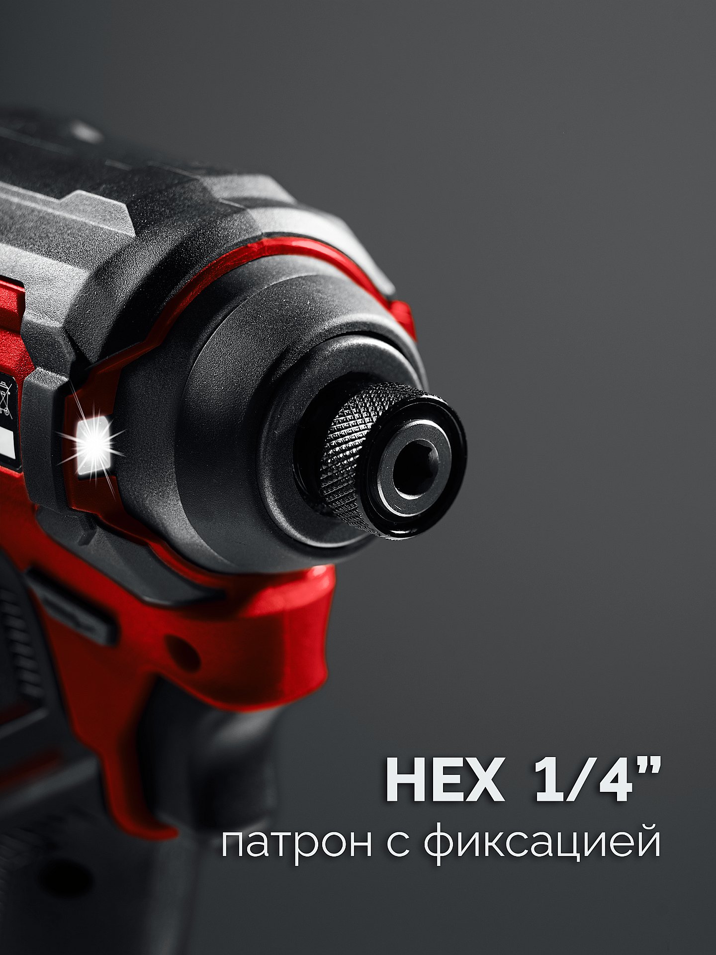 - Патрон с внутренним HEX 1/4'' позволяет устанавливать стандартный сменный инструмент без оттягивания втулки