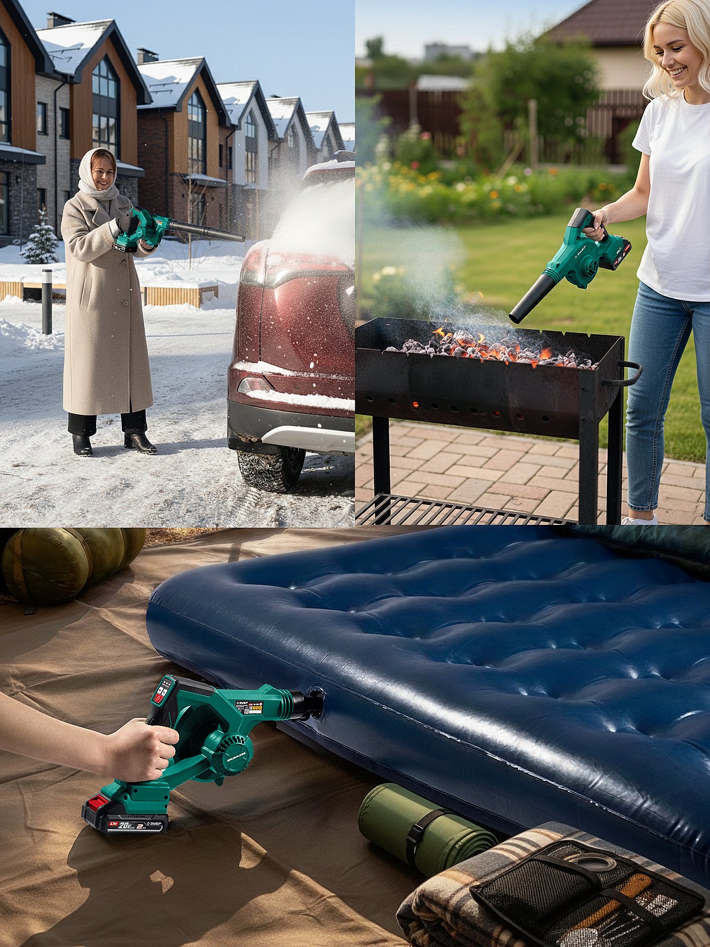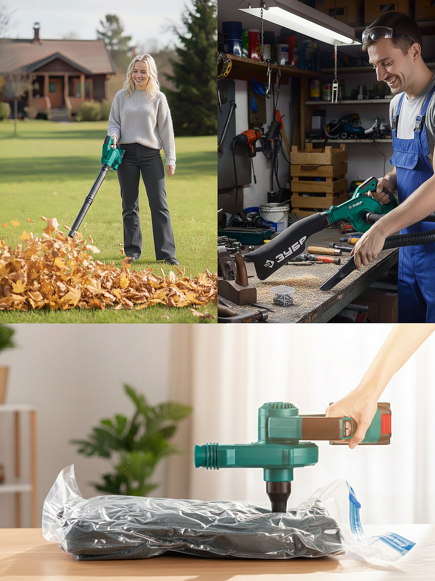 Для уборки листьев, мелкого мусора и пыли, накачивания надувных изделий