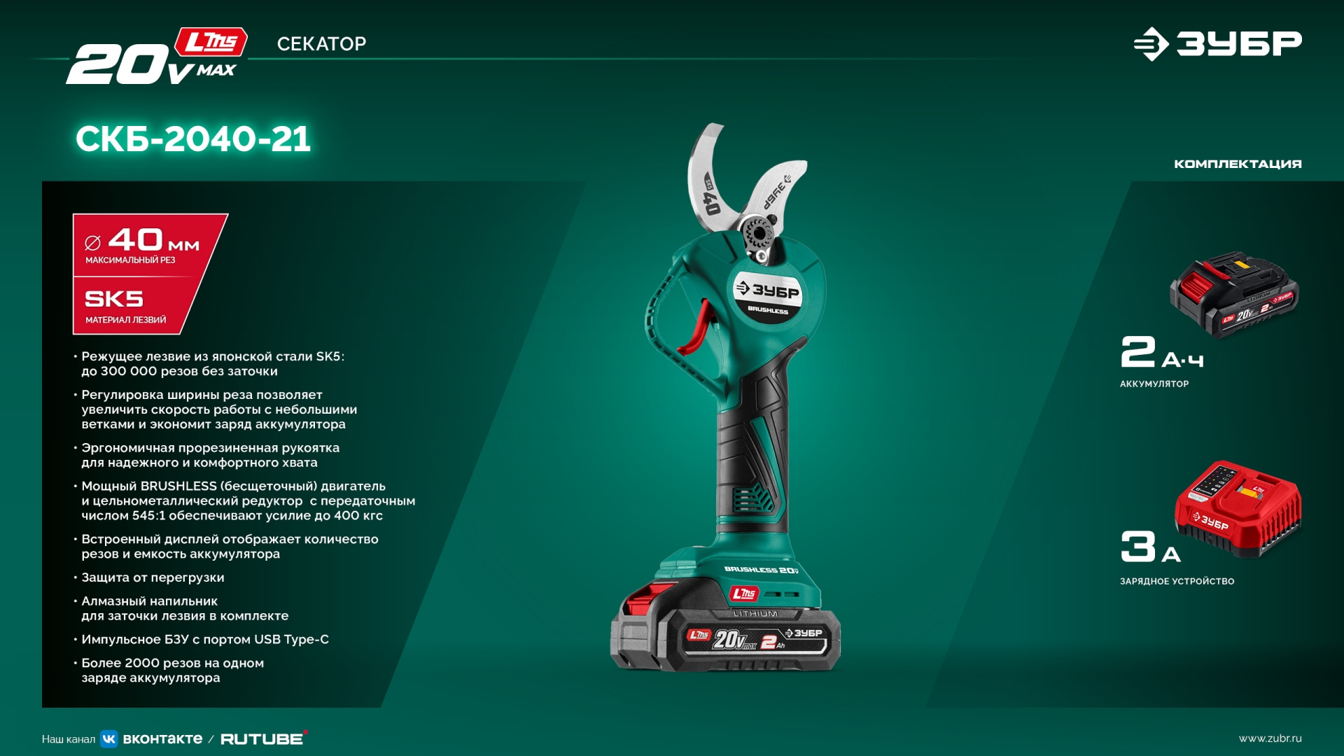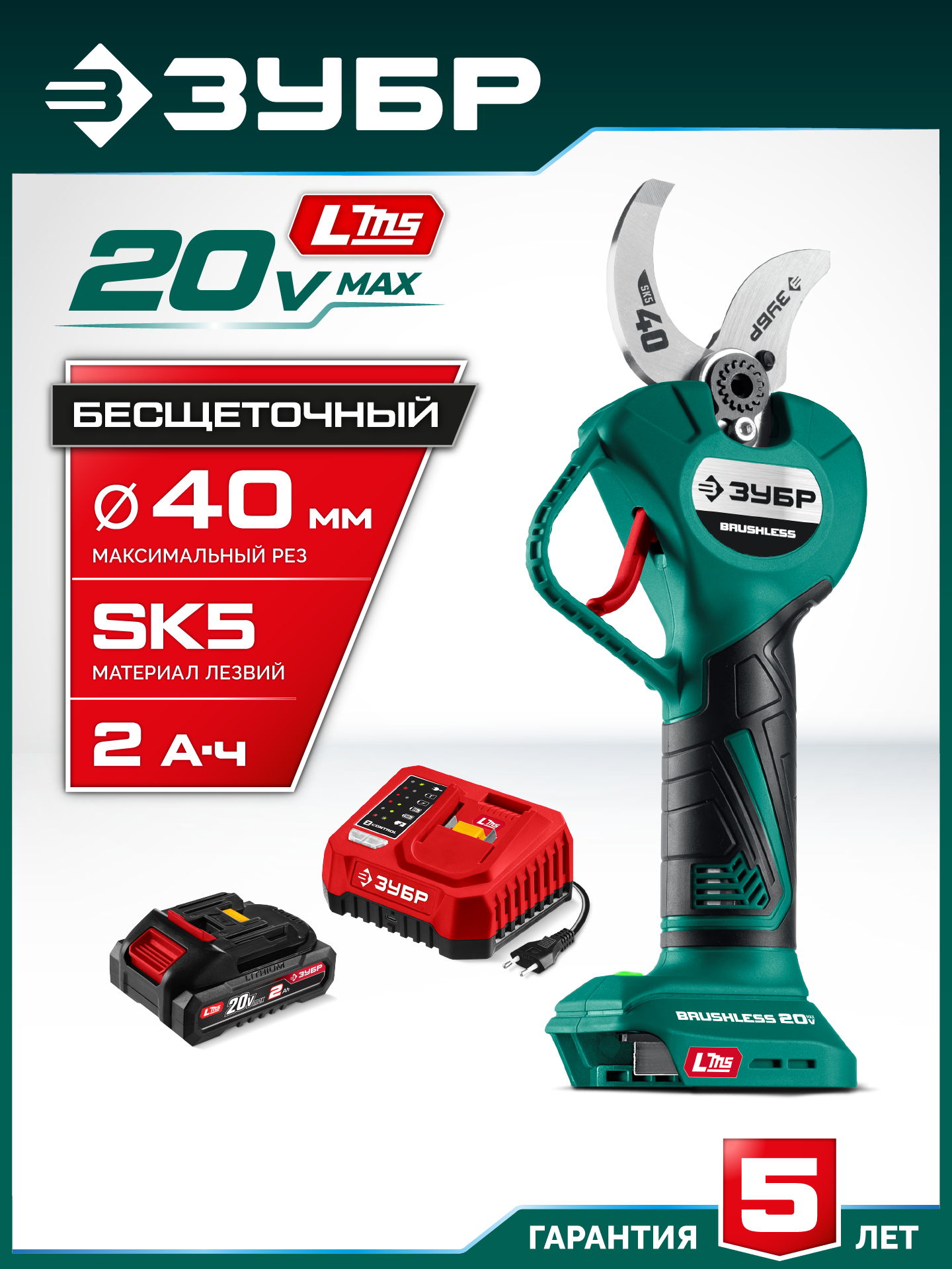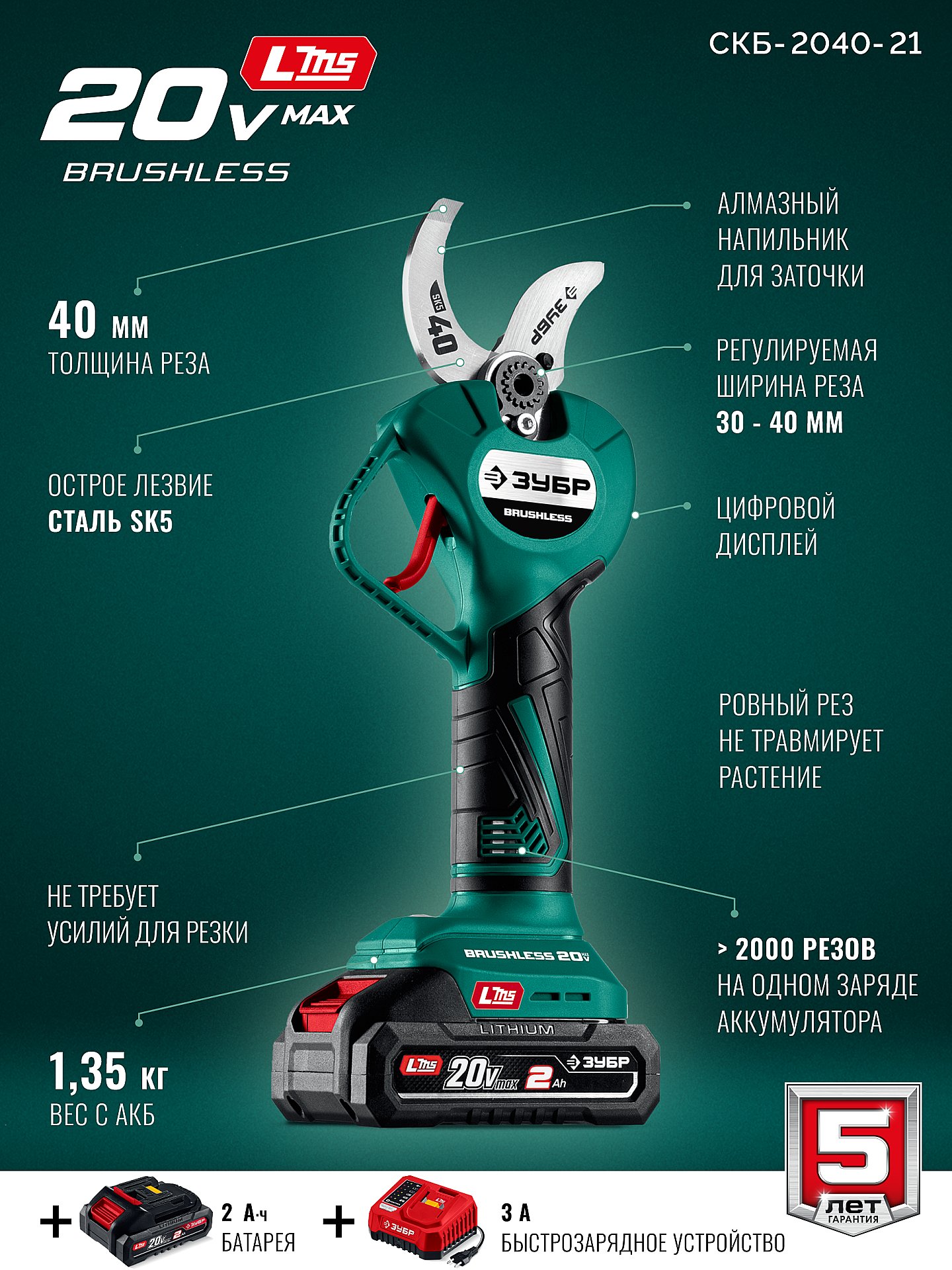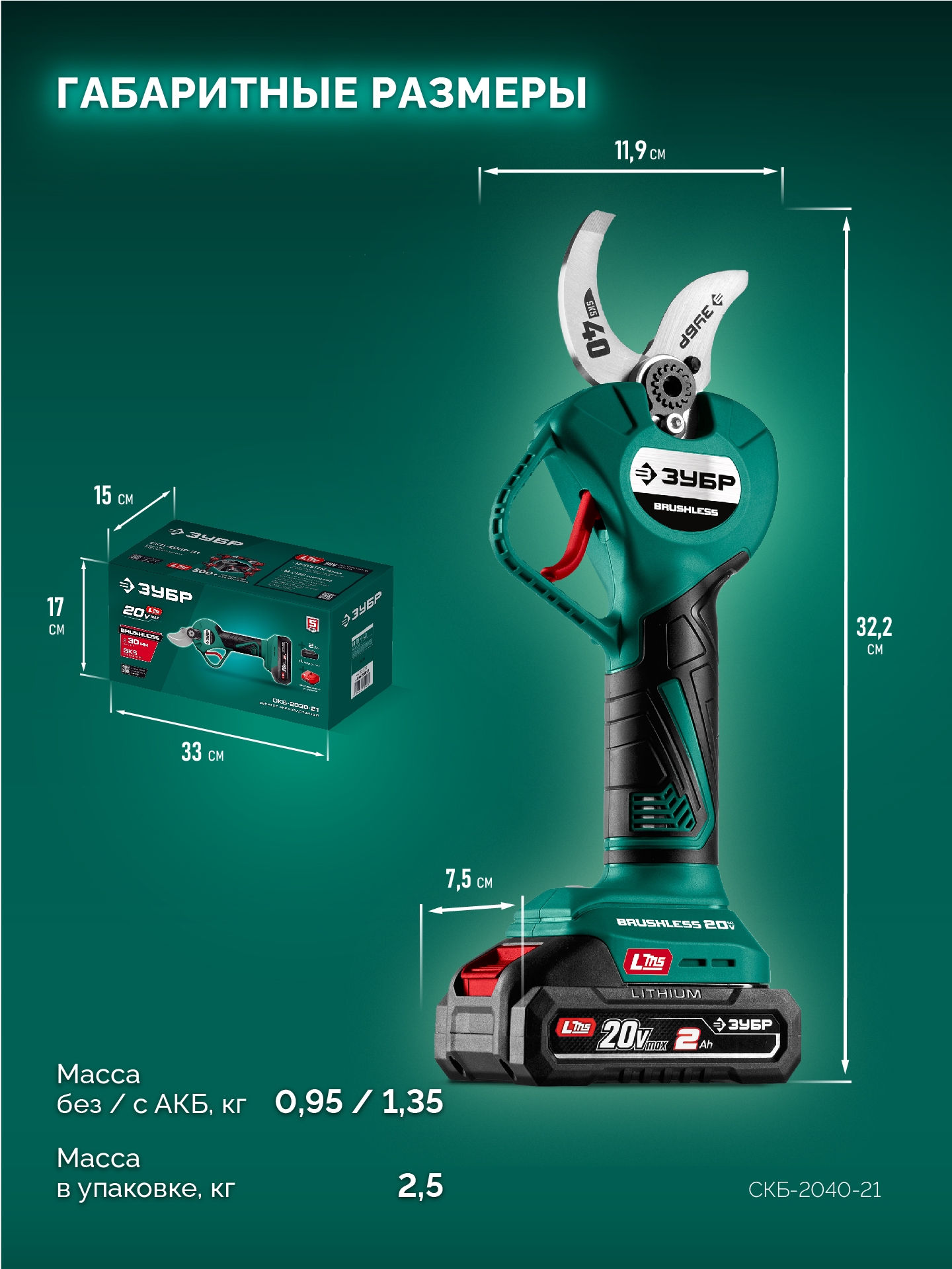 Аккумуляторный секатор ЗУБР - удобный инструмент для срезания веток кустарников и деревьев. Большая ширина захвата с возможностью настройки, мощный бесщеточный двигатель и сверхострое режущее лезвие из сплава SK5, позволяют производить ровный срез не прилагая излишних усилий.