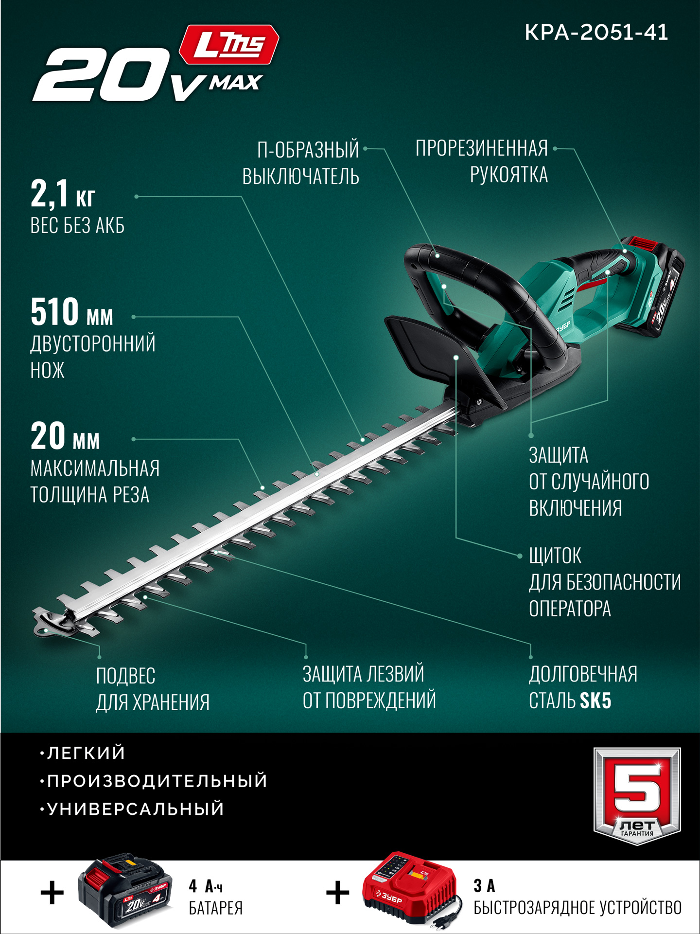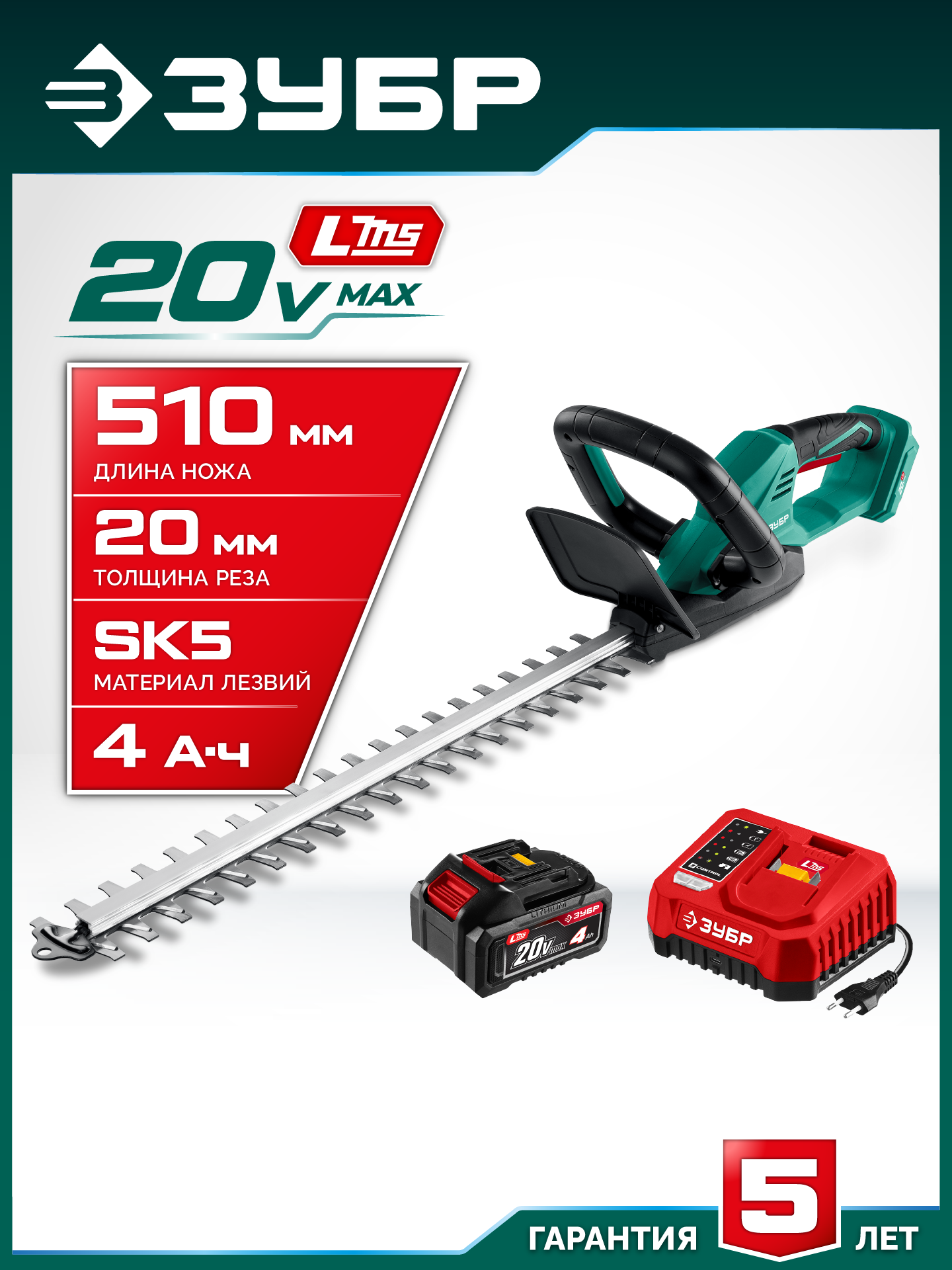 Аккумуляторный кусторез предназначен для ухода за живыми изгородями, стрижки кустарников и деревьев. Он может быть использован для выполнения как прямой, так и фигурной подрезки, превращая ваш сад в произведение искусства. Лезвия выполнены из японской стали SK5 и гарантируют быстрый рез и долгий срок службы. Комплектация с аккумулятором высокой емкости и быстрозарядным устройством позволяет приступить к работе сразу после покупки.