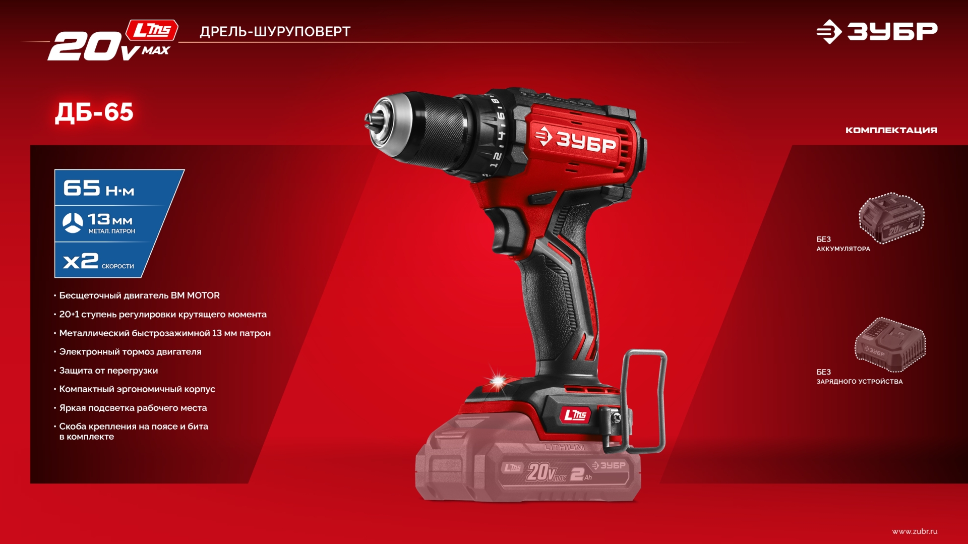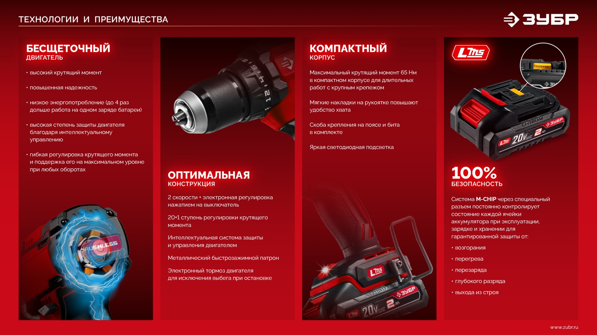 Бесщеточная дрель-шуруповерт ЗУБР системы LMS с увеличенным крутящим моментом предназначена для быстрого заворачивания саморезов до 8 мм диаметром и сверления отверстий до 30 мм в дереве. Длительная работа от одного заряда обеспечивается эффективным двигателем BRUSHLESS