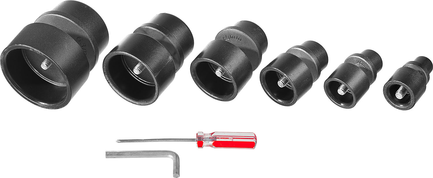 - В комплекте представлены нагревательные насадки для труб диаметром 20,25,32,40,50,63 мм