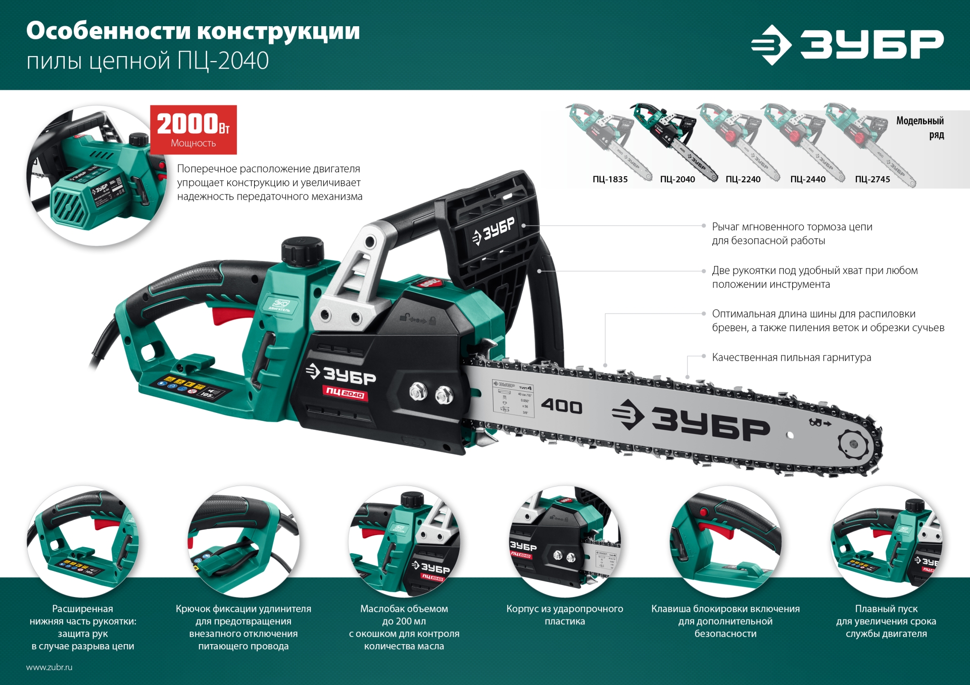 - Автоматическая система смазки цепи дозированно подает масло в зависимости от нагрузки
