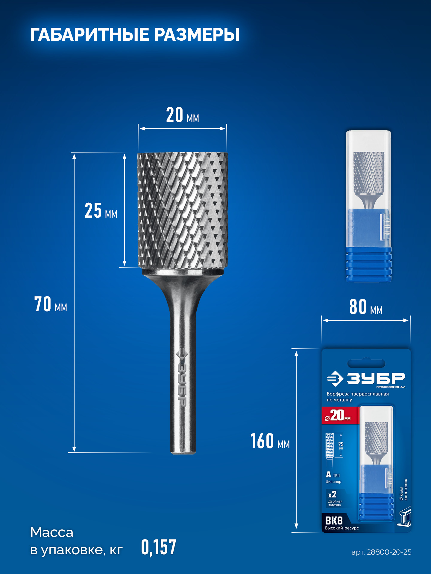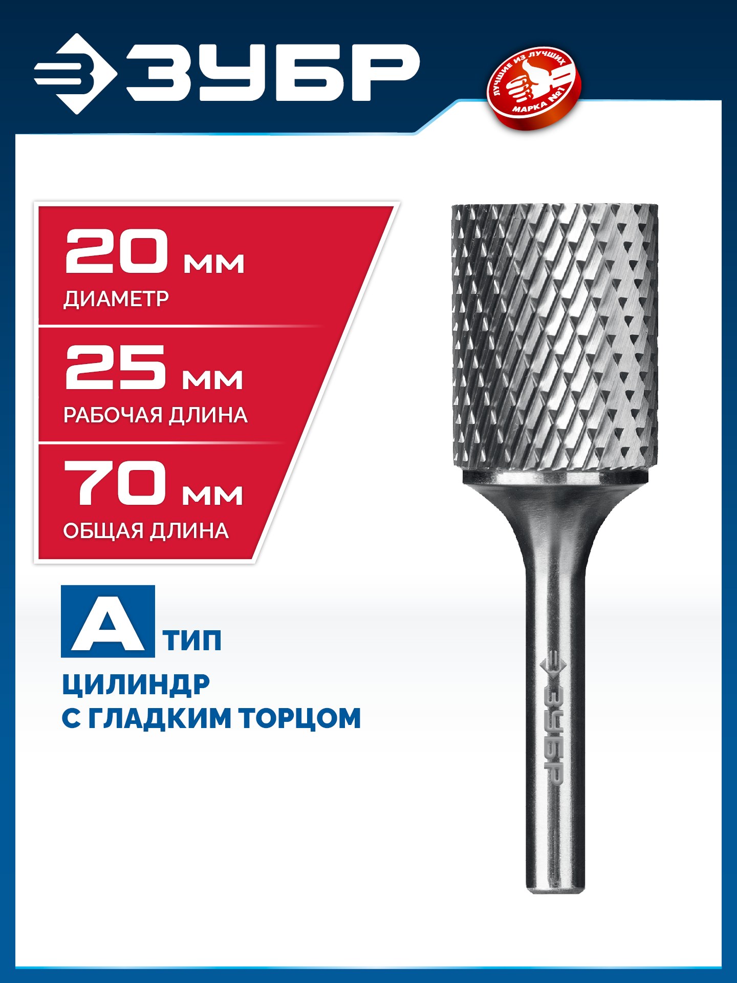 ЗУБР 20х25 мм, тип А (цилиндр с гладким торцом), хв-к 6 мм, твердосплавная борфреза, ПРОФЕССИОНАЛ (28800-20-25)