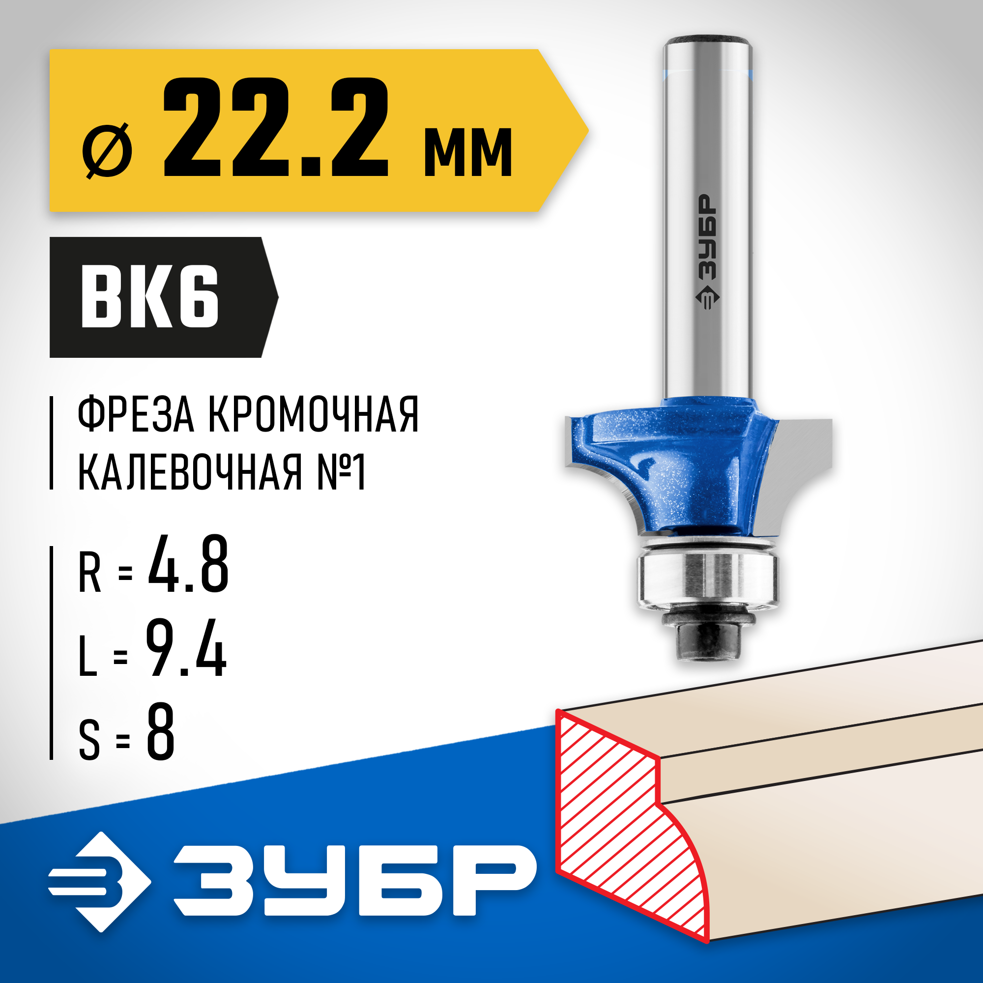 ЗУБР 22.2 x 9.4 мм, радиус 4.8 мм, фреза кромочная калевочная №1, Профессионал (28701-22.2)