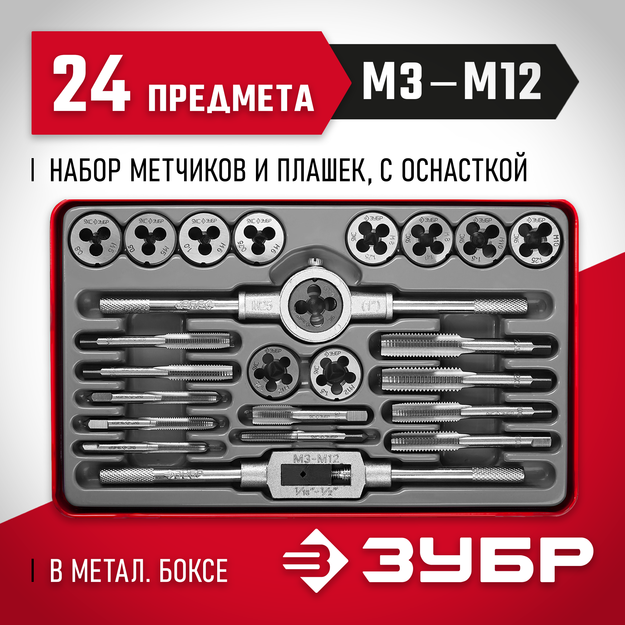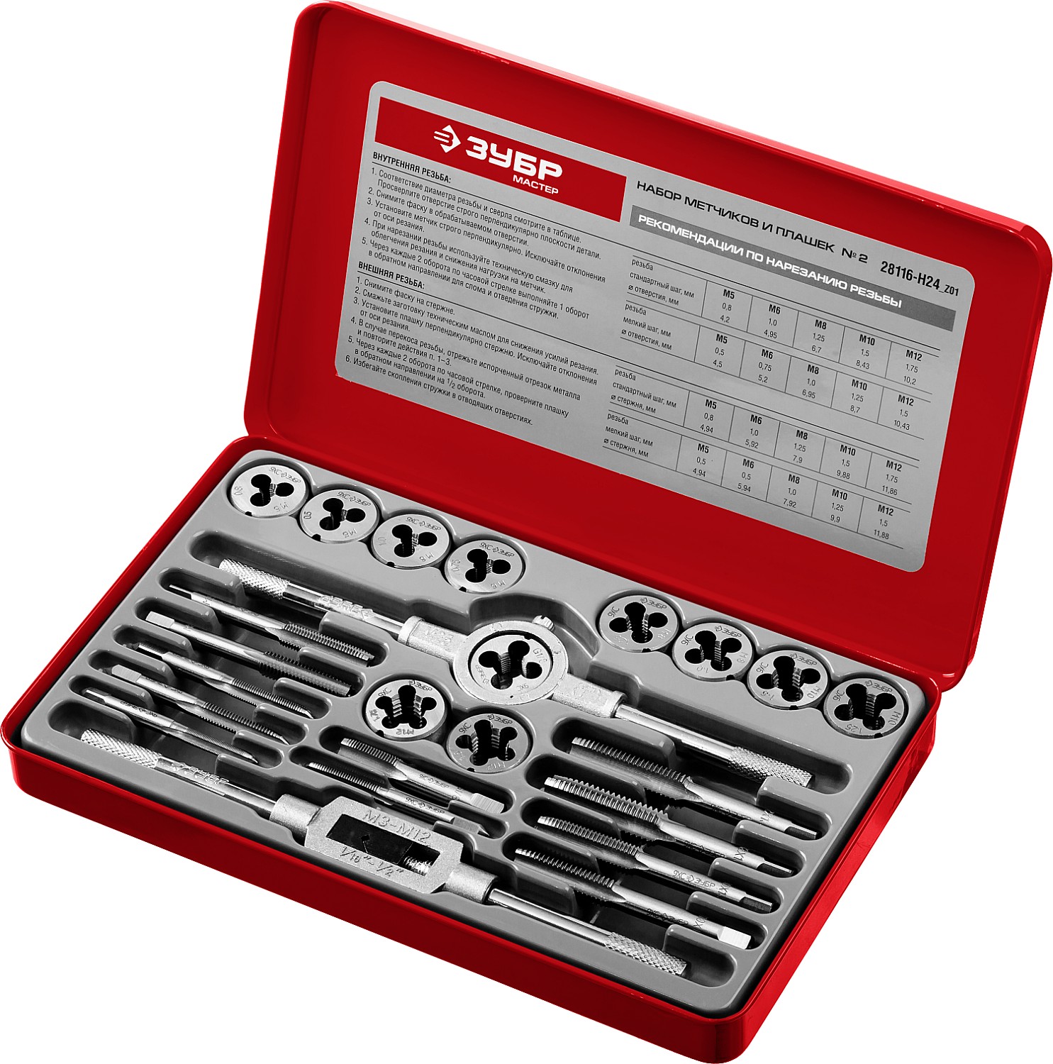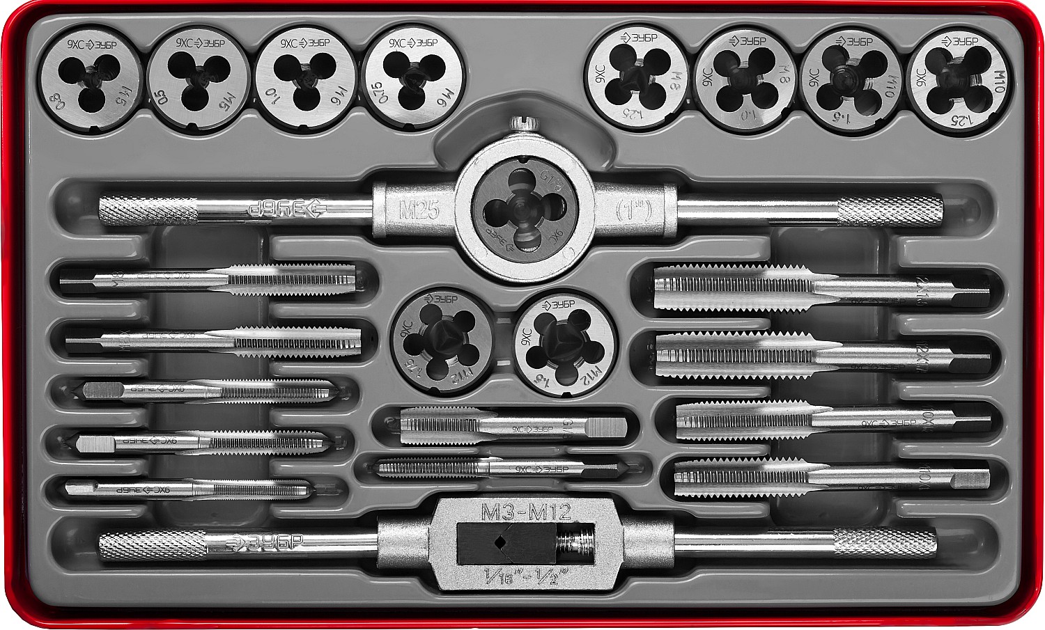 Набор предназначен для нарезания и калибрования внутренней и внешней метрической и трубной резьбы в сквозных и глухих отверстиях в сталях с пределом прочности до 900Н/мм2, цветных металлах, пластике.
