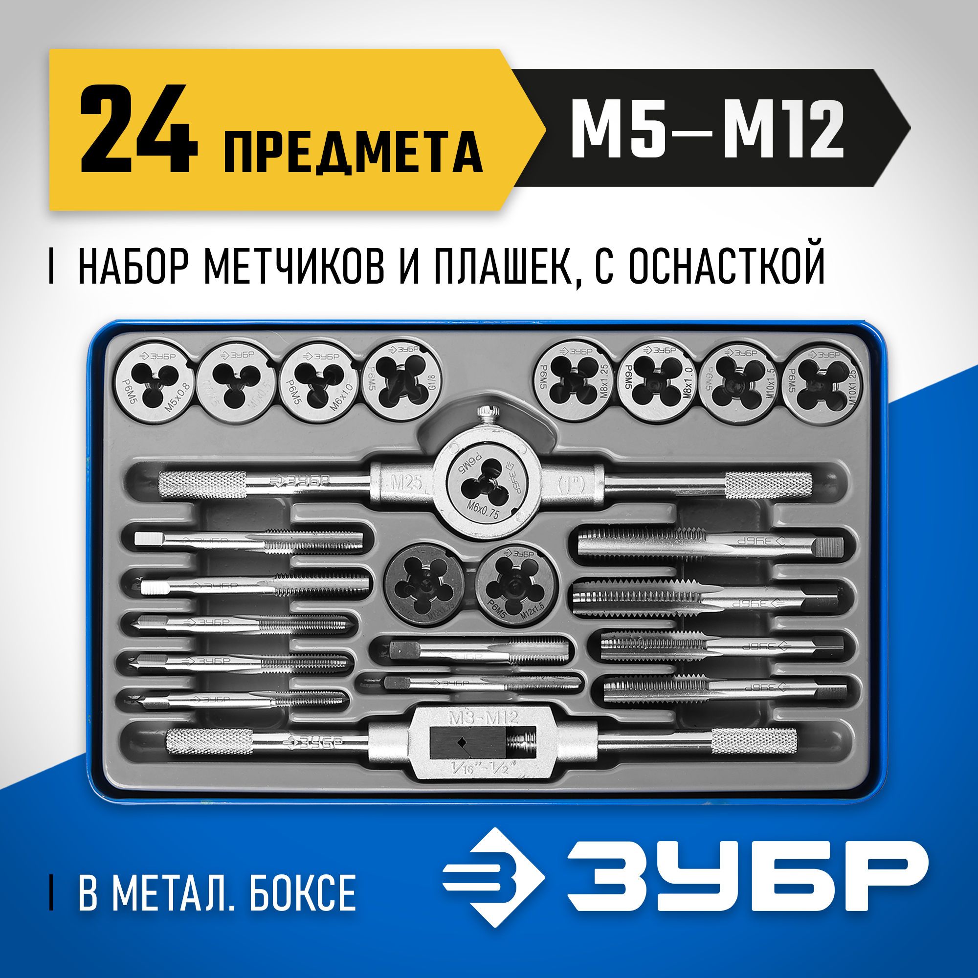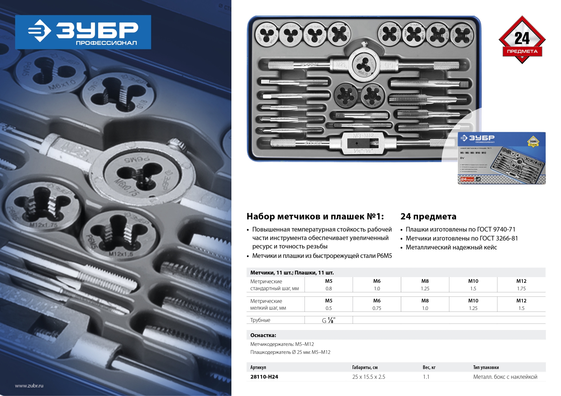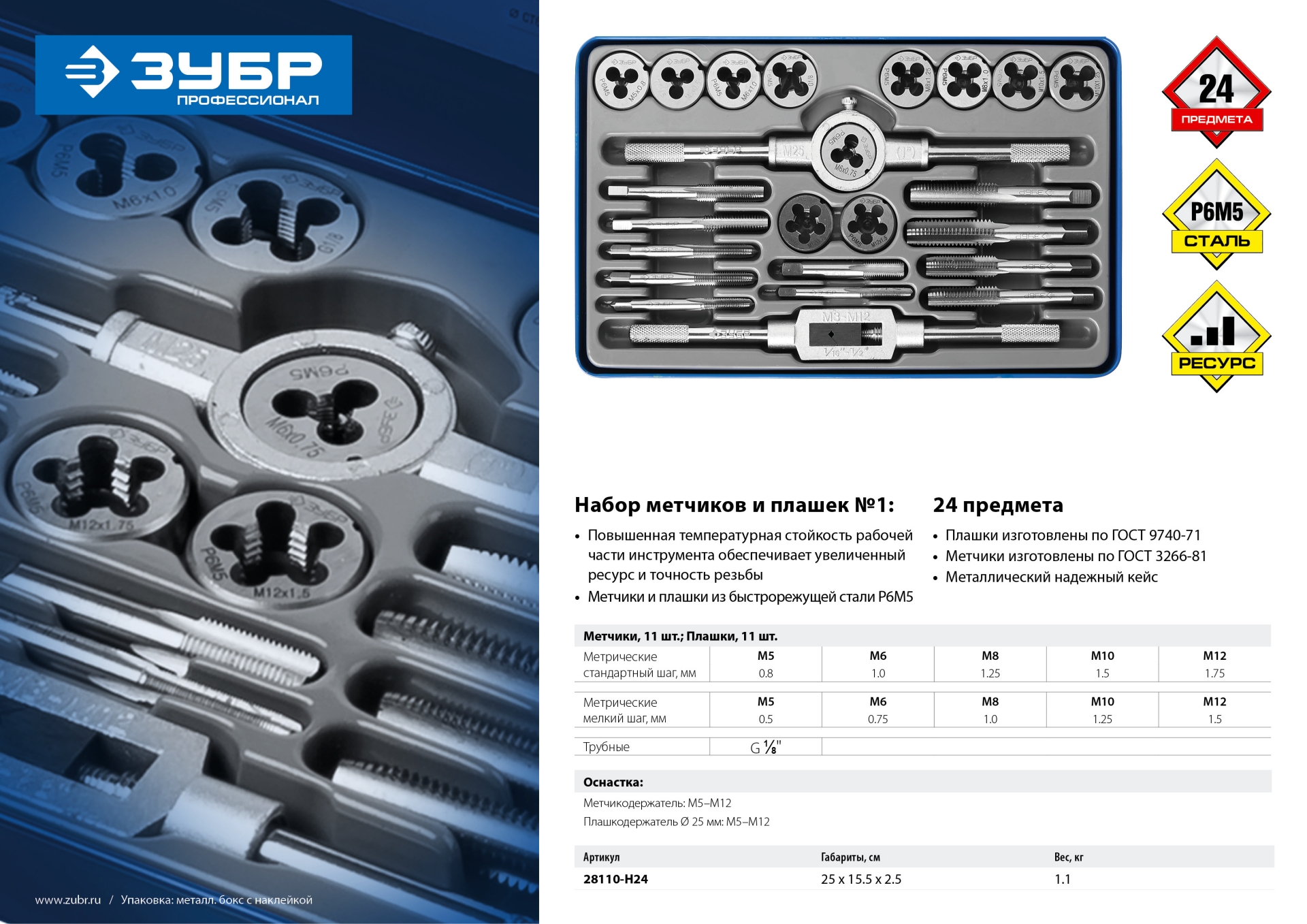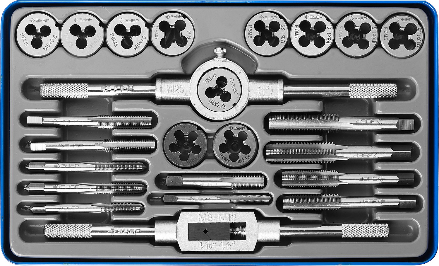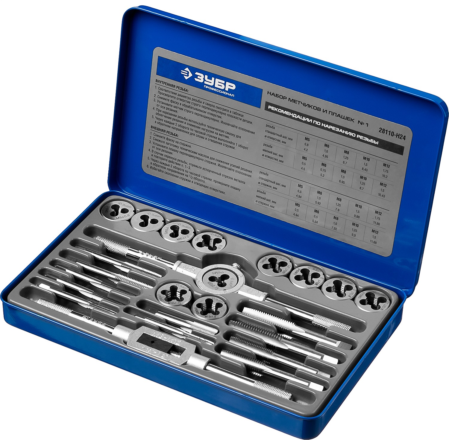 Набор предназначен для нарезания и калибрования внутренней и внешней метрической и трубной резьбы в сквозных и глухих отверстиях в сталях с пределом прочности до 900Н/мм2, цветных металлах, пластике.