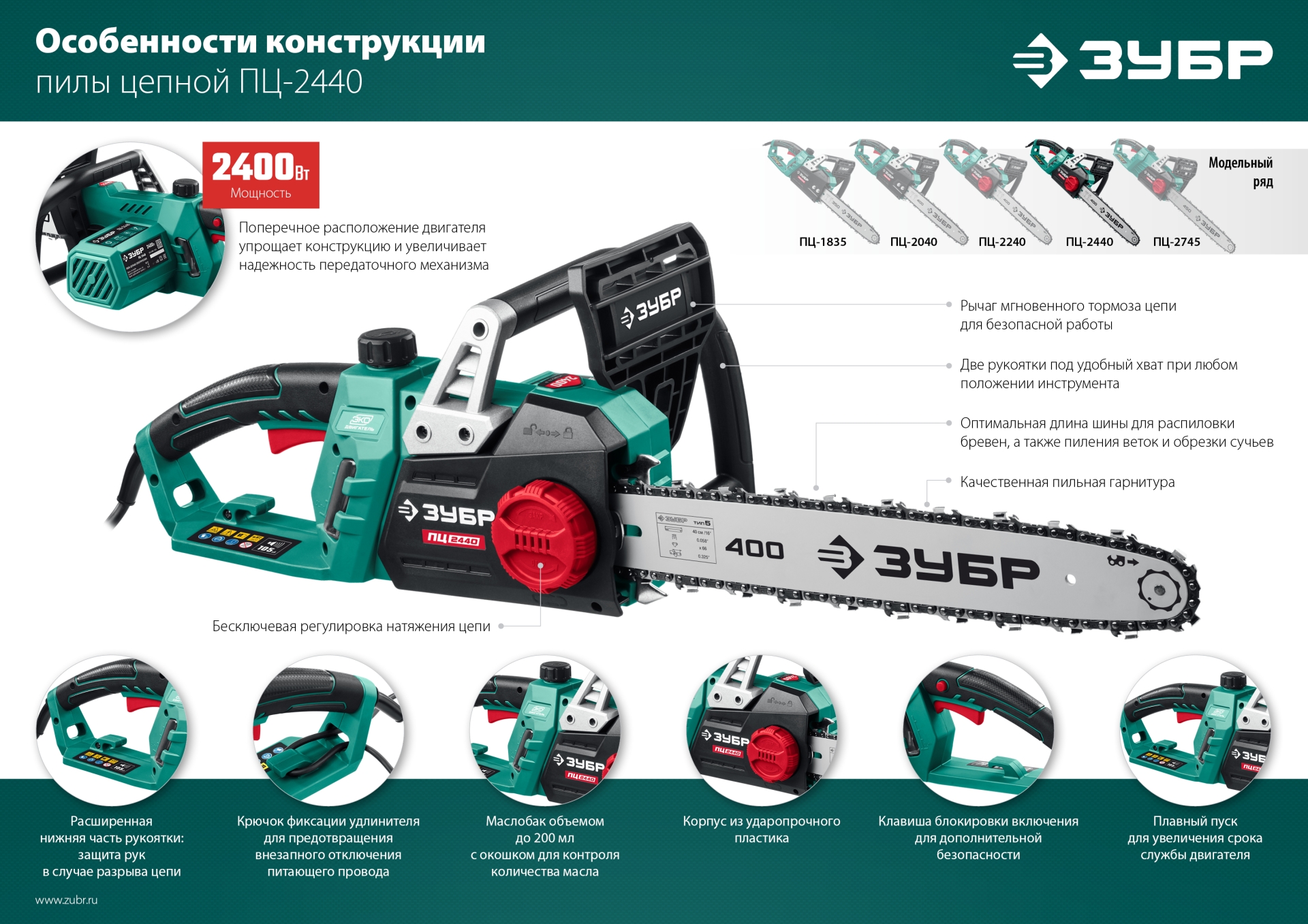 - Шина длиной 400 мм позволяет распиливать заготовки большого диаметра