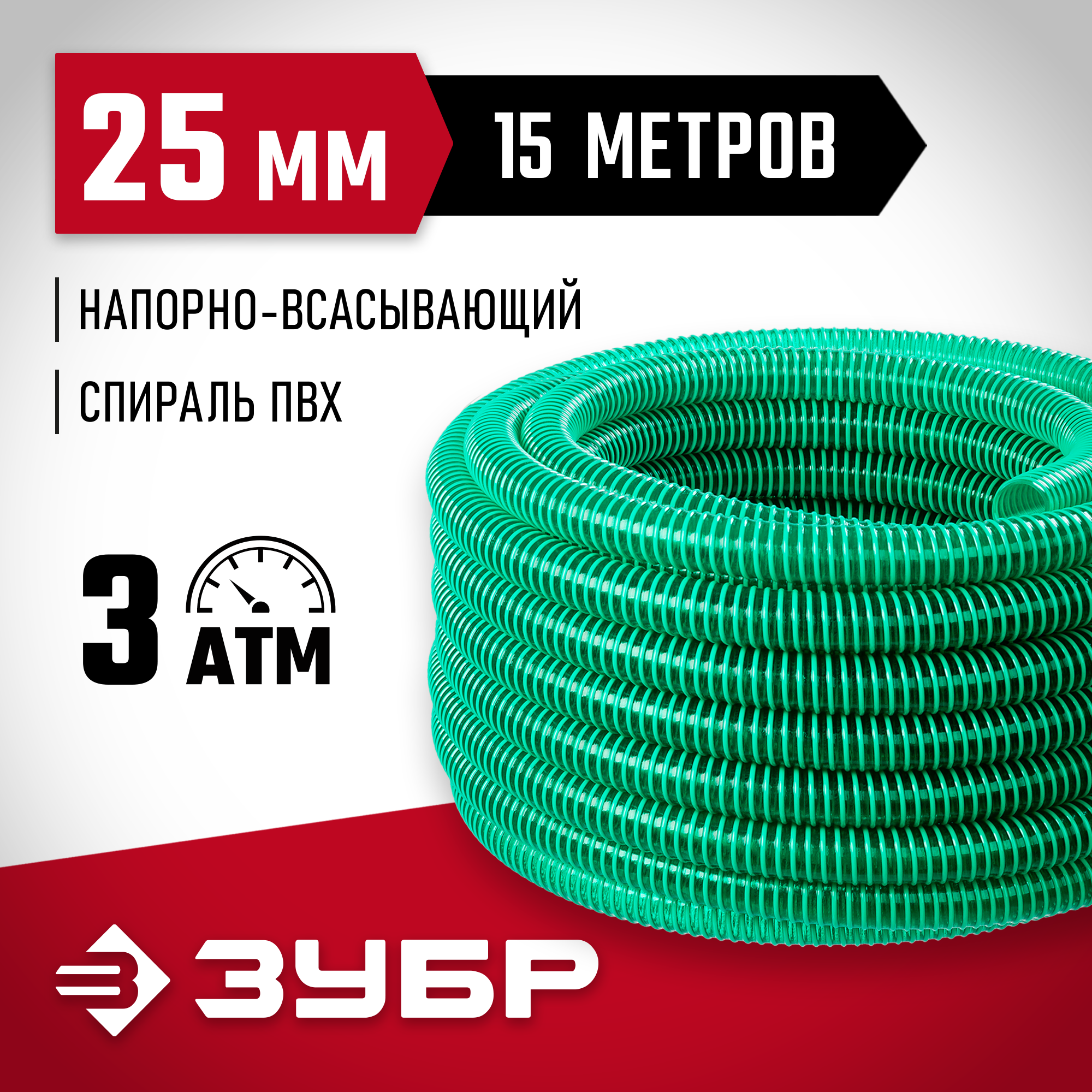 ЗУБР 25 мм x 15 м, 3 атм, со спиралью ПВХ, напорно-всасывающий шланг (40325-25-15)