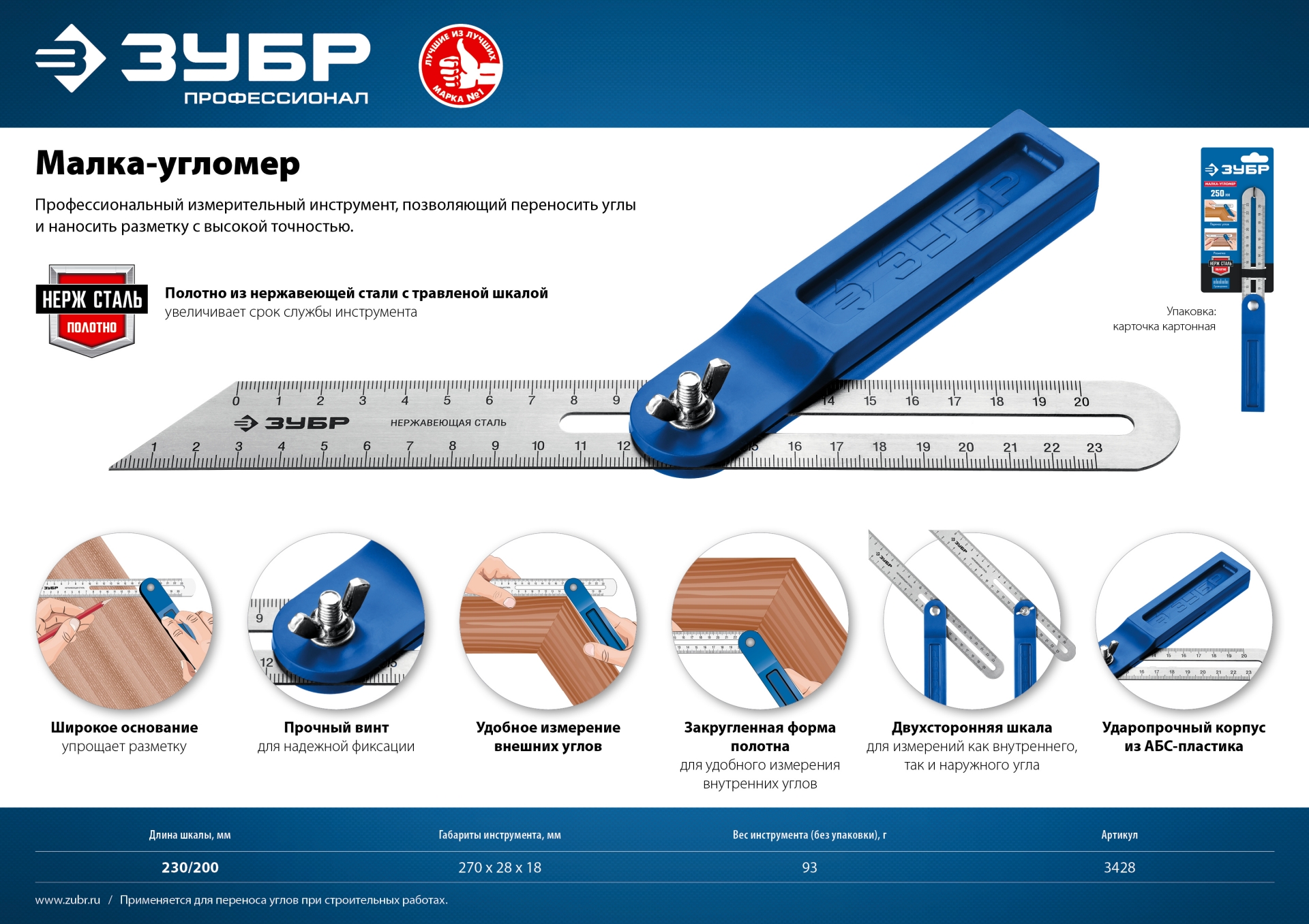 - Полотно из нержавеющей стали с травлёной шкалой увеличивает срок службы инструмента.