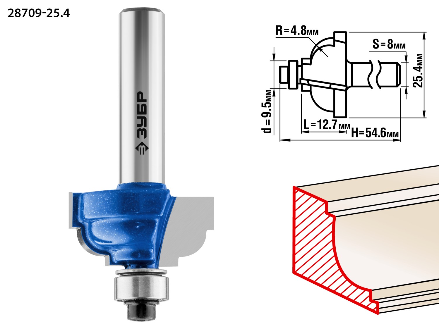 ЗУБР 25.4 x 13 мм, радиус 4.8 мм, фреза кромочная калевочная №7, Профессионал (28709-25.4)