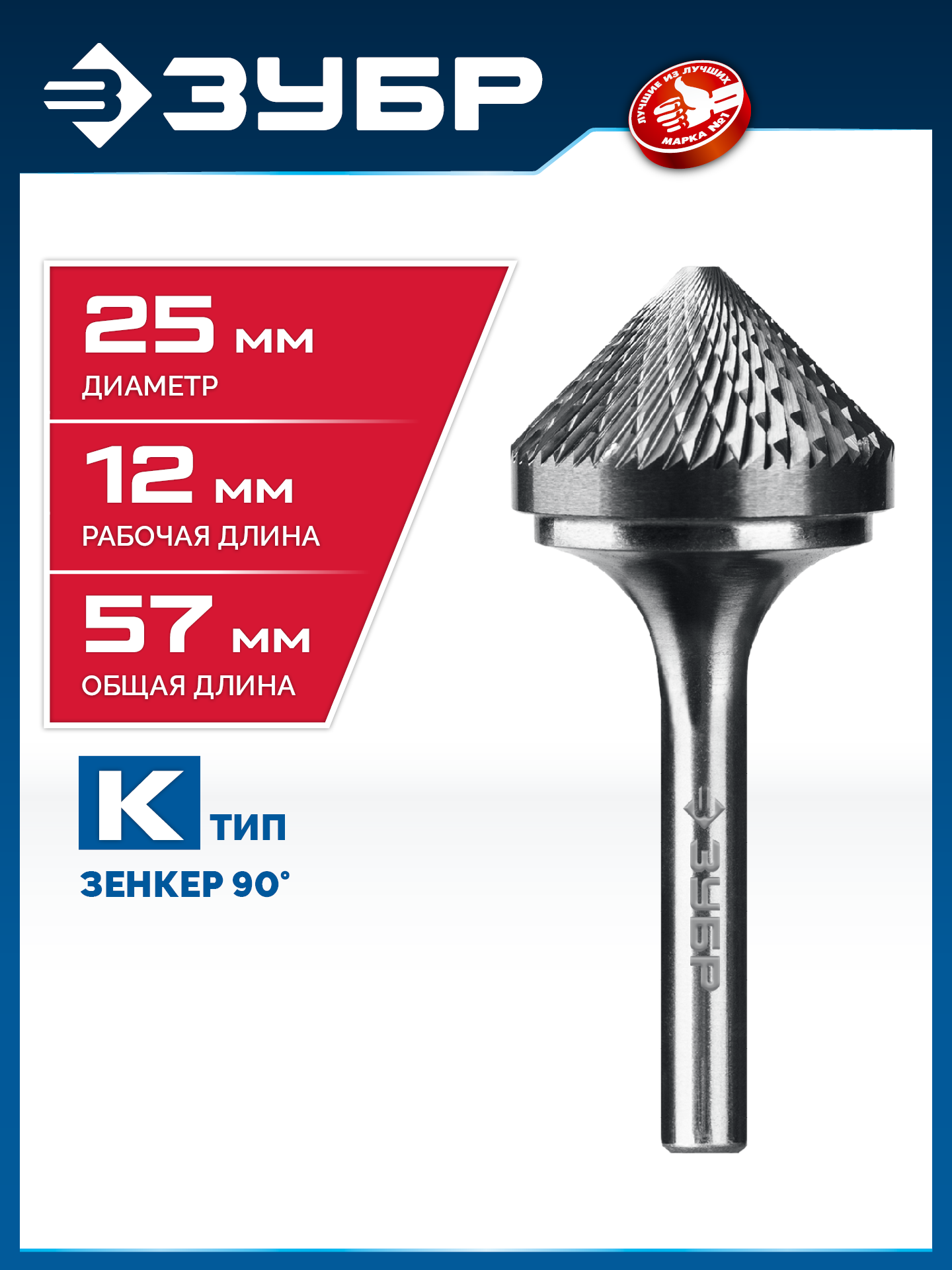 ЗУБР 25х12 мм, тип K (зенкер с вершиной 90°), хв-к 6 мм, твердосплавная борфреза, ПРОФЕССИОНАЛ (28809-25-12)