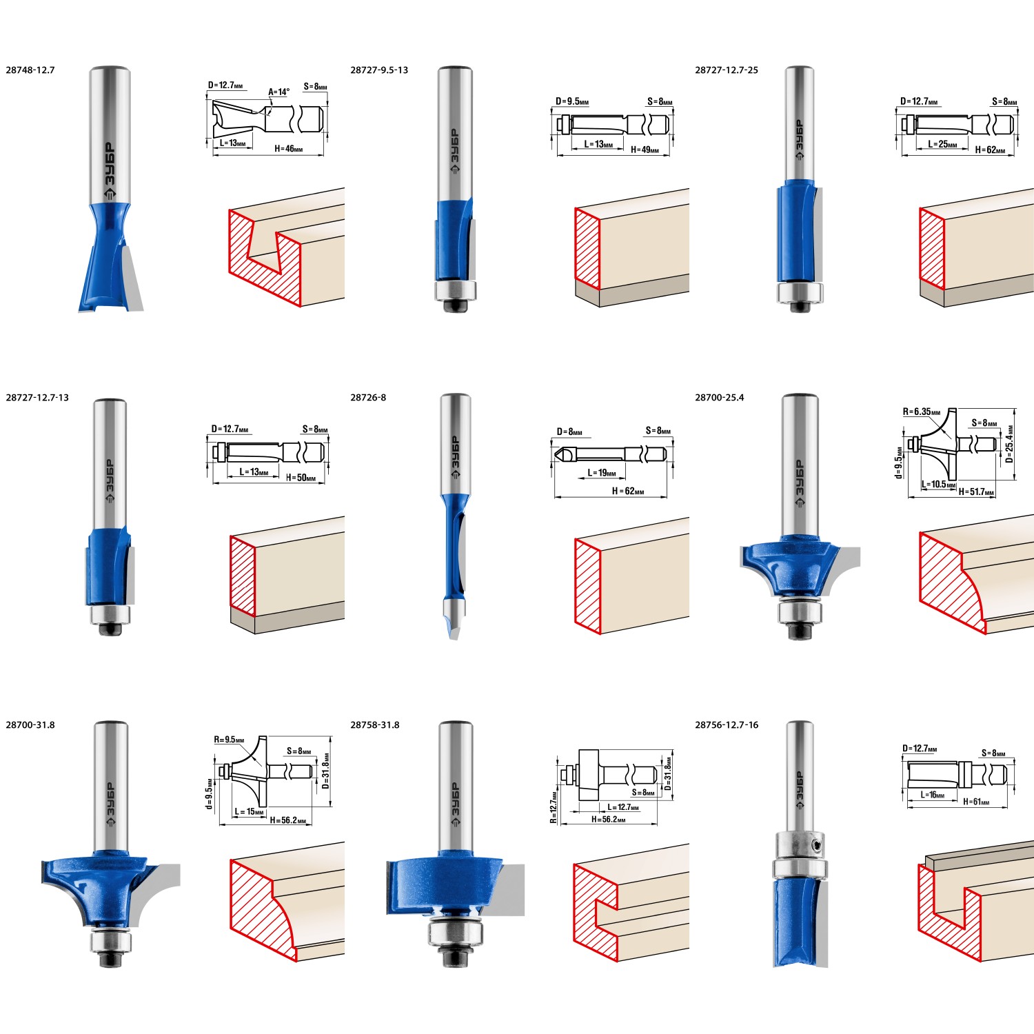 Набор фрез отлично подходит для профилирования кромок, изготовления декоративных пазов и рисунков, фрезерования канавок при работе с различными видами древесины.