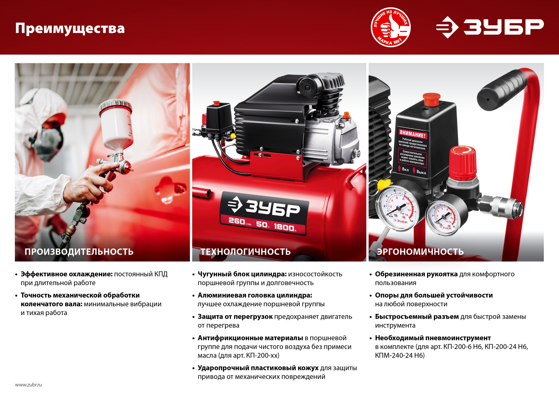 Производительные и надежные универсальные аппараты, которые помогут Вам во время работы в мастерской, Высокая производительность, возможность регулирования расхода воздуха и автоматический режим работы изделия позволяют работать без простоев. При правильной эксплуатации в соответствии с рекомендациями производителя ресурс данных компрессоров – не менее 2500 часов*. * на основании результатов испытаний лаборатории компании АО «ЗУБР ОВК»