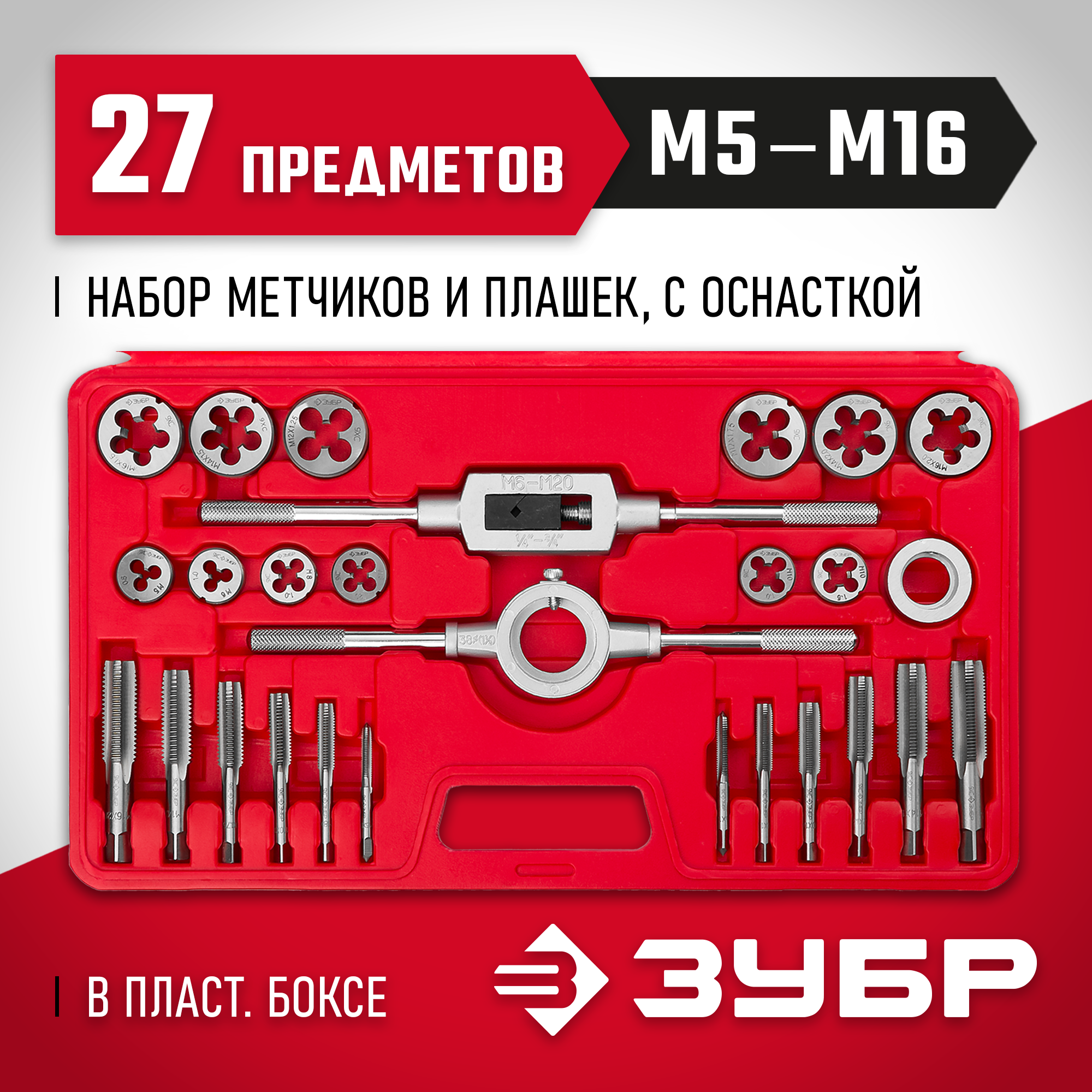 Набор предназначен для резьбонарезных работ в конструкциях и заготовках из сталей и цветных металлов. Метчики ручные однопроходные используются для нарезания внутренней метрической резьбы с нормальным шагом в глухих и сквозных отверстиях. Плашки предназначены для нарезания внешней метрической резьбы с нормальным шагом. Метчикодержатель предназначен для надежного закрепления метчиков Плашкодержатель используется для закрепления плашек при проведении резьбонарезных работ