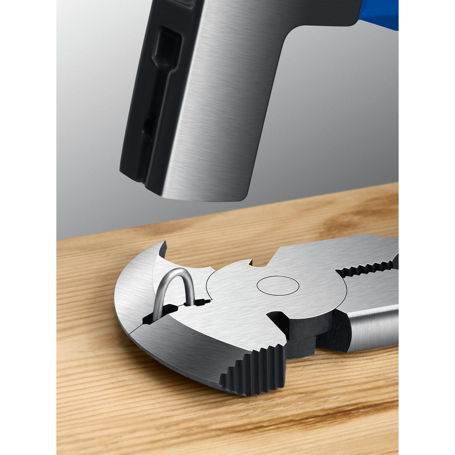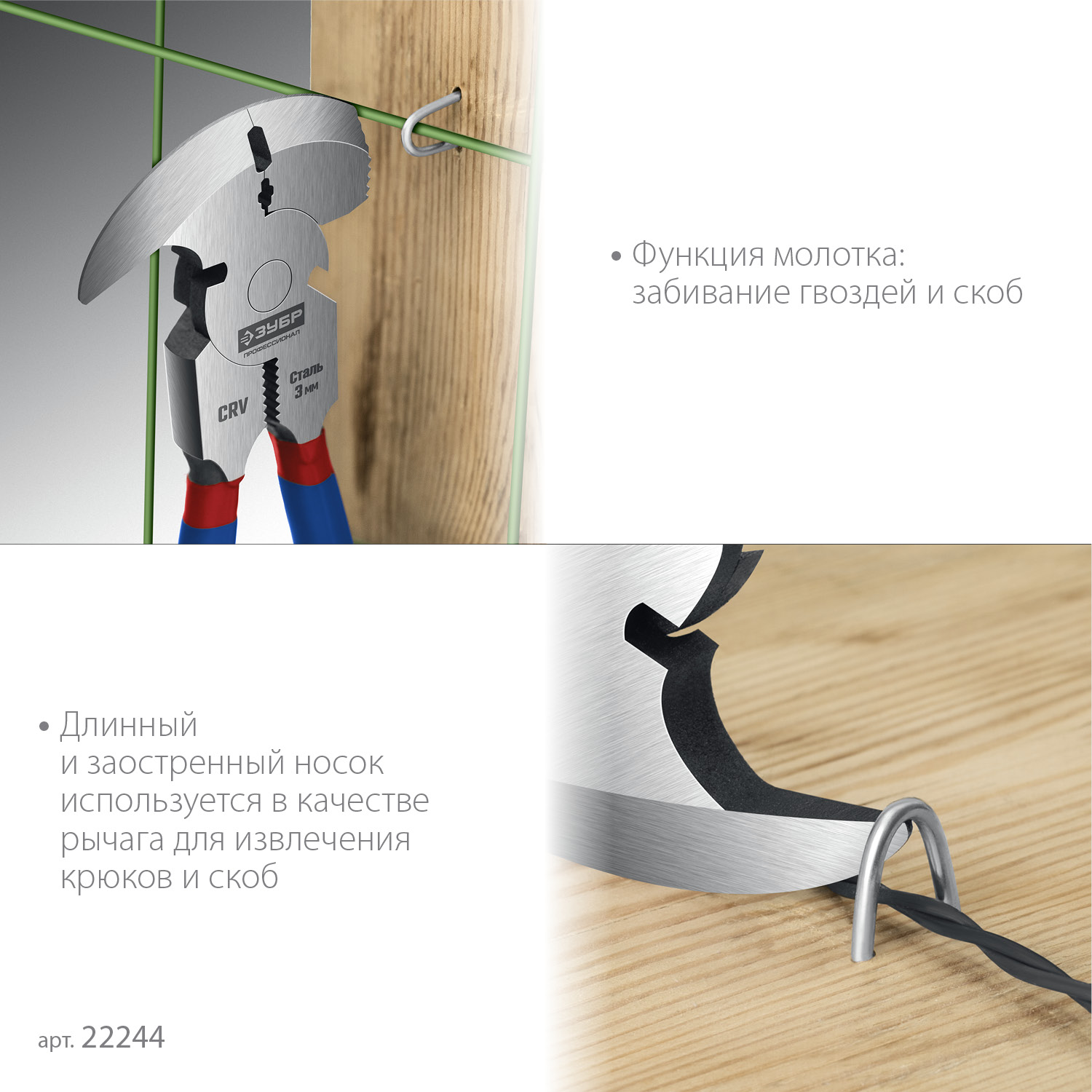 - Многофункциональный инструмент: функции откусывания, сгибания и удержания проволоки, молоток, выдергивание крюков