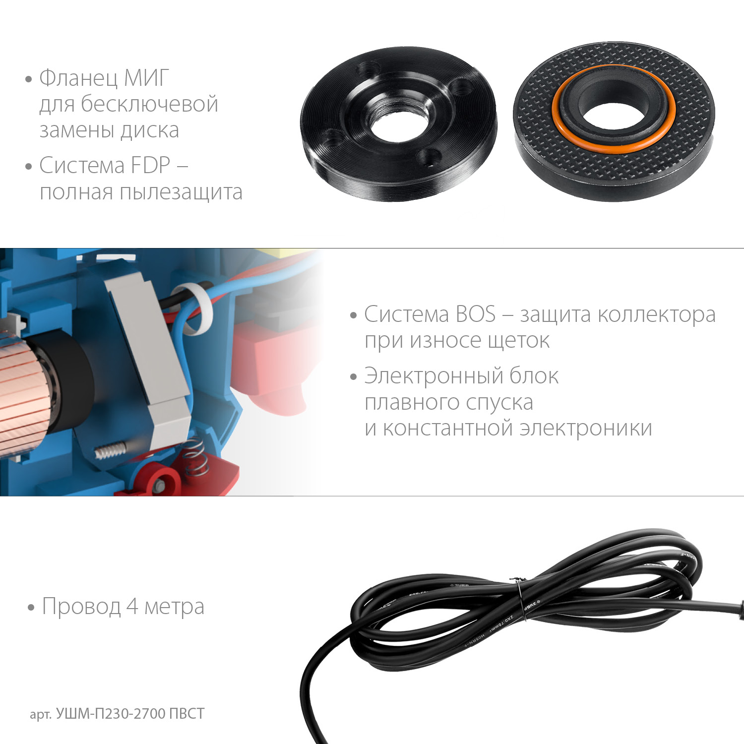 - Кабель питания с увеличенной длиной 4м в резиновой изоляции