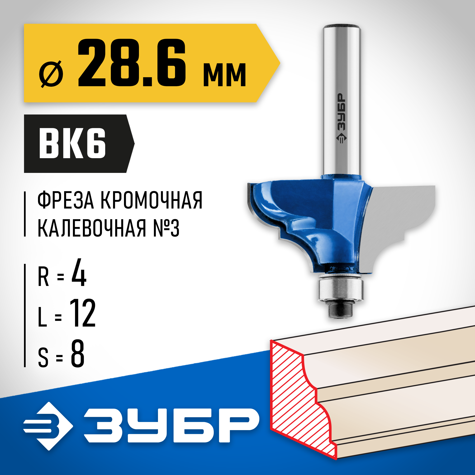 ЗУБР 28.6 x 12 мм, радиус 4 мм, фреза кромочная калевочная №2, Профессионал (28704-28.6)