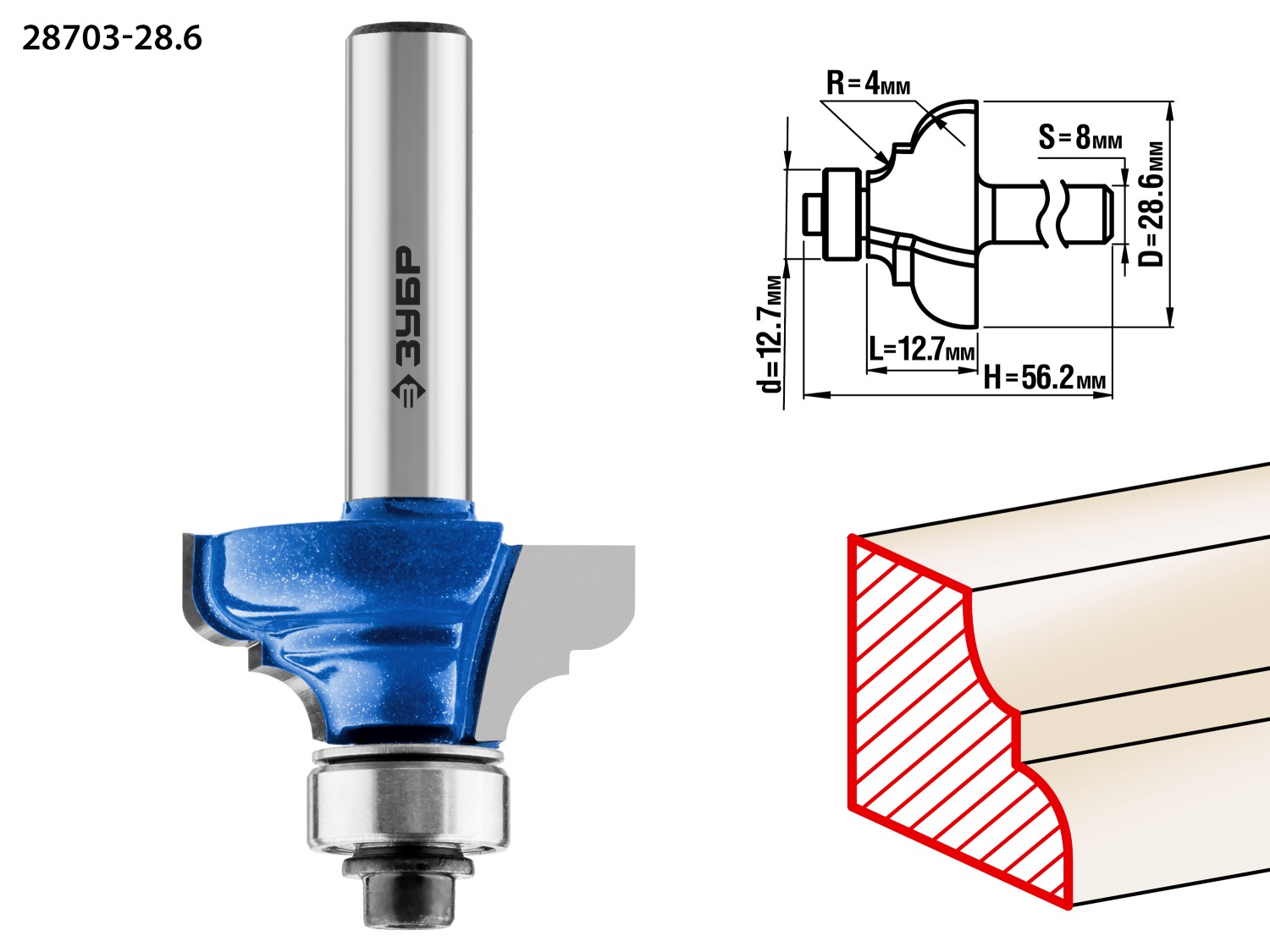 ЗУБР 28.6 x 12.7 мм, радиус 4 мм, фреза кромочная калевочная №3, Профессионал (28703-28.6)