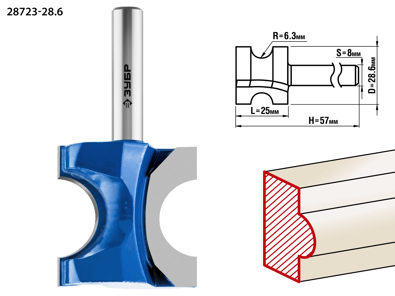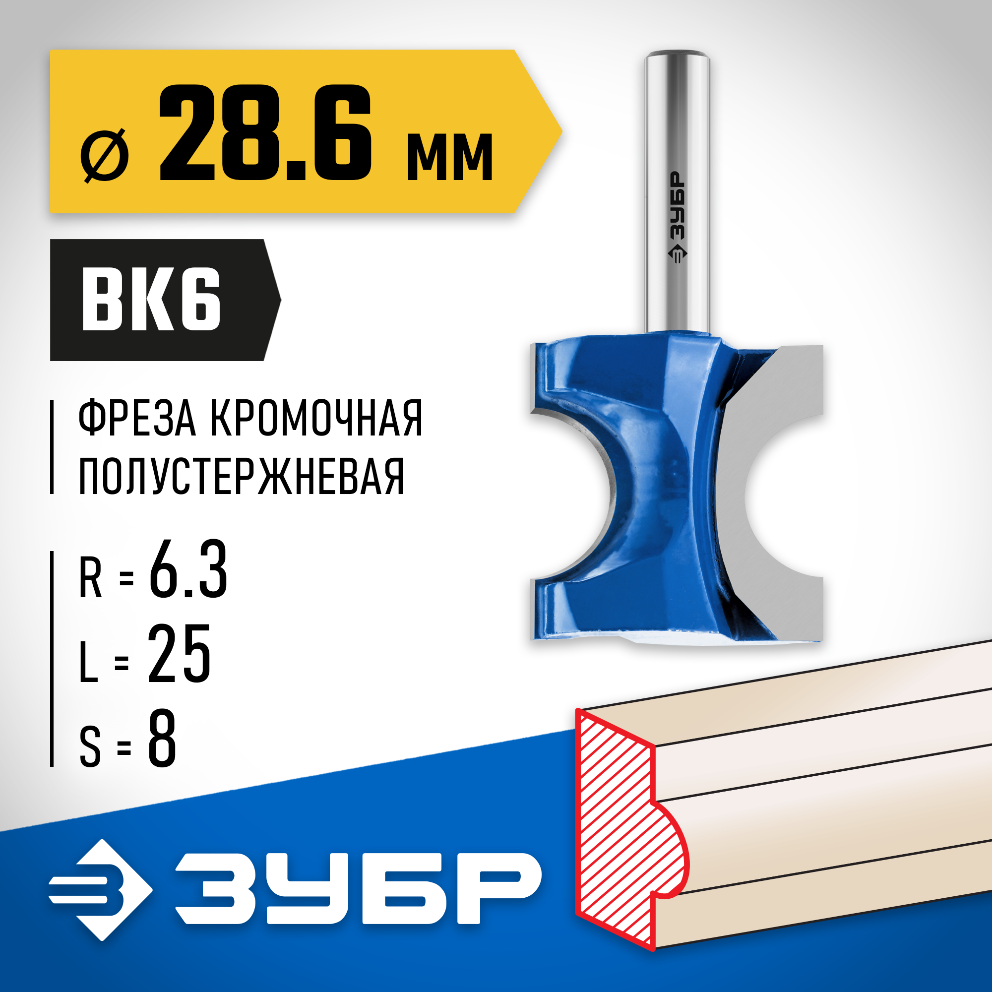ЗУБР 28.6 x 25 мм, радиус 6.3 мм, фреза полустержневая, Профессионал (28723-28.6)