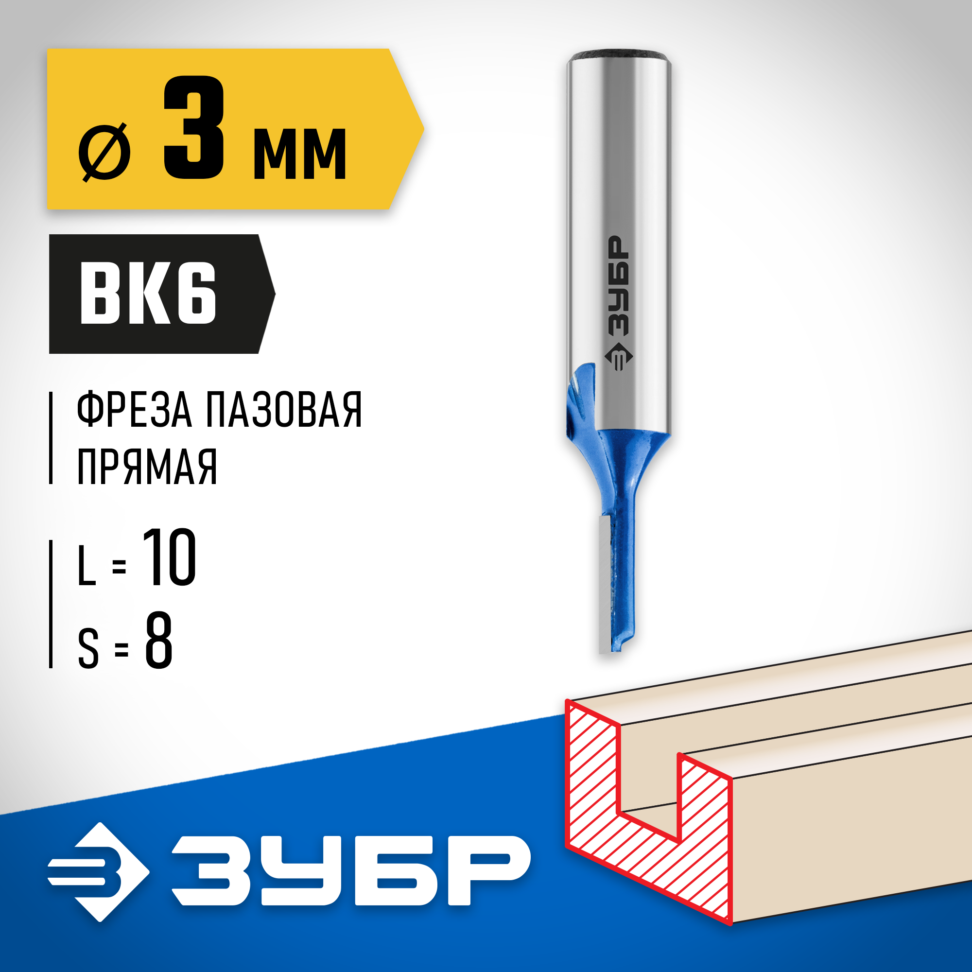 ЗУБР 3 x 10 мм, хвостовик 8 мм, фреза пазовая прямая, Профессионал (28753-3-10)