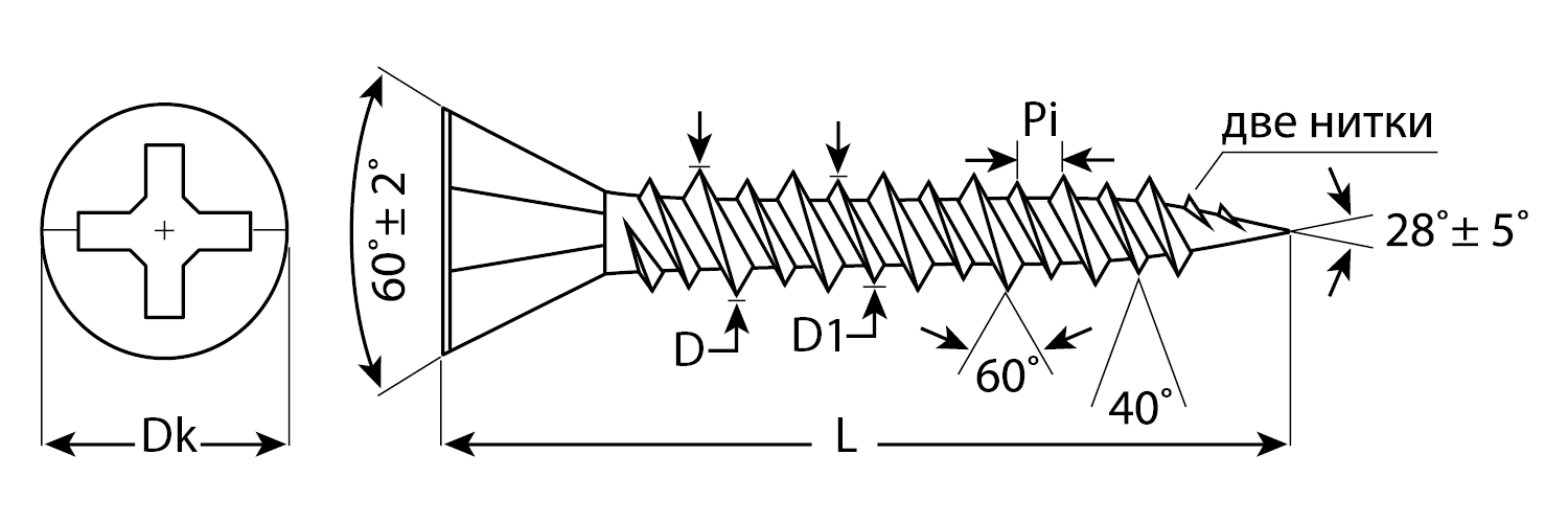 Саморезы для крепления гипсоволоконных листов (ГВЛ) изготовлены из стального прутка с высоким содержанием углерода. Контроль за геометрией самореза начинается с калибровки прутка и заканчивается тщательной проверкой размеров готового изделия. Нормативная твердость стали достигается термической обработкой. Поверхностная твердость 550-800HV, твердость в сердцевине 240-425HV. Саморезы легко вкручиваются обычным шуруповертом или отверткой с крестообразным шлицем PH2 (DIN). Предварительное сверление в скрепляемых материалах не требуется. Геометрические размеры: диаметр головки (Dk) - 6.9-7.3мм, диаметр высокой резьбы (D) - 4.05-4.25мм, диаметр низкой резьбы (D1) - 2.9-3.2мм, шаг резьбы (Pi) - 1.59мм.
