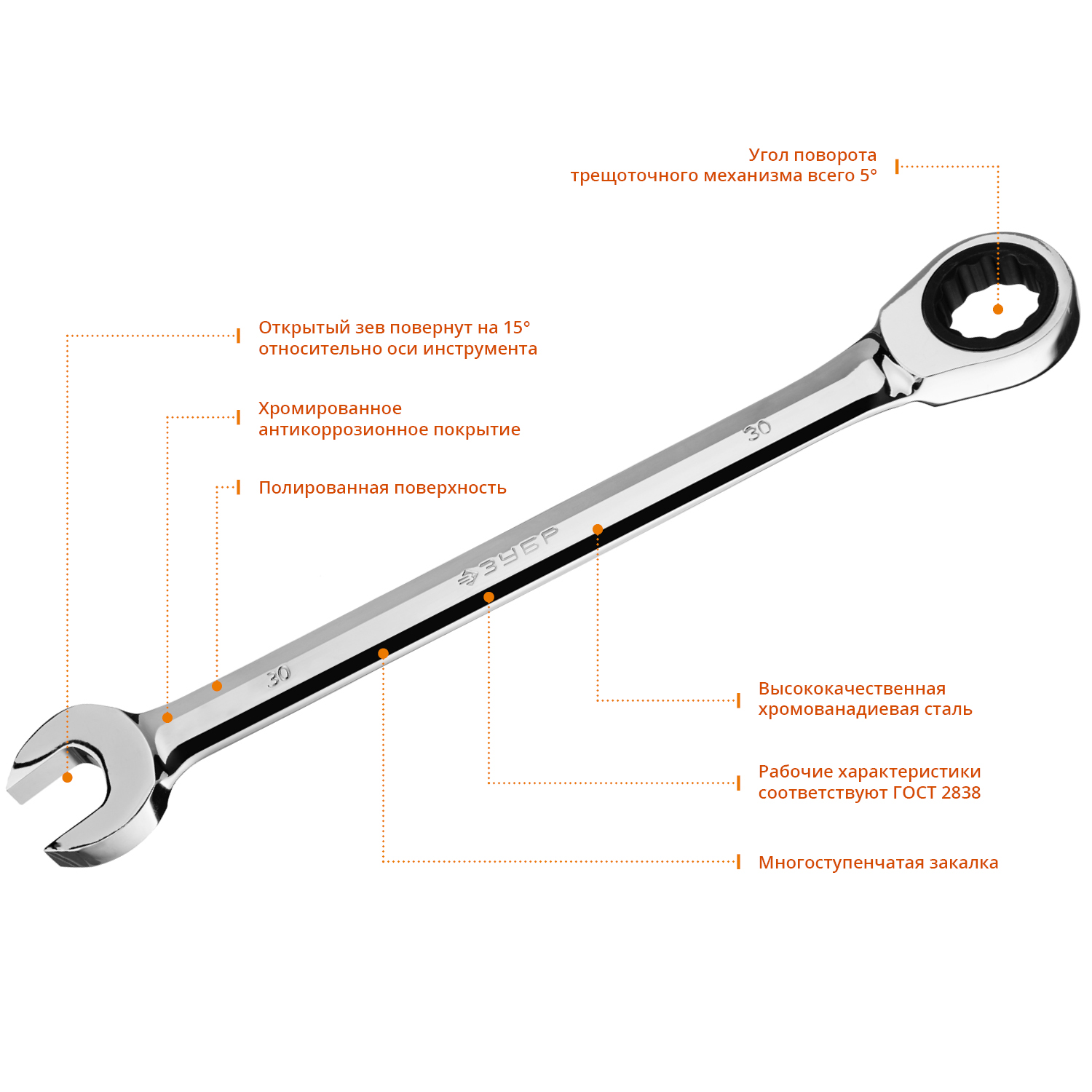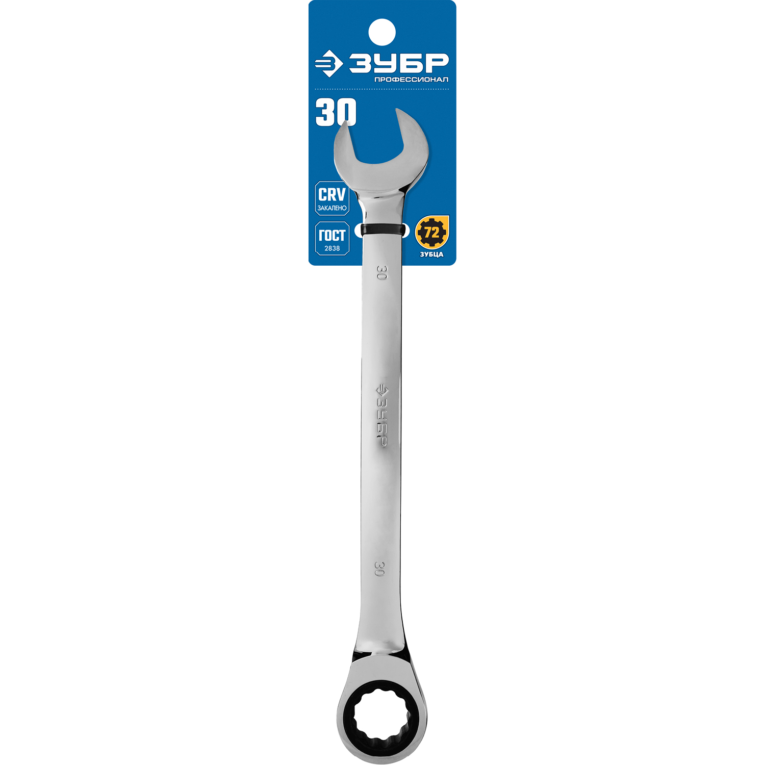 ЗУБР 30 мм, комбинированный трещоточный гаечный ключ, Профессионал (27074-30)