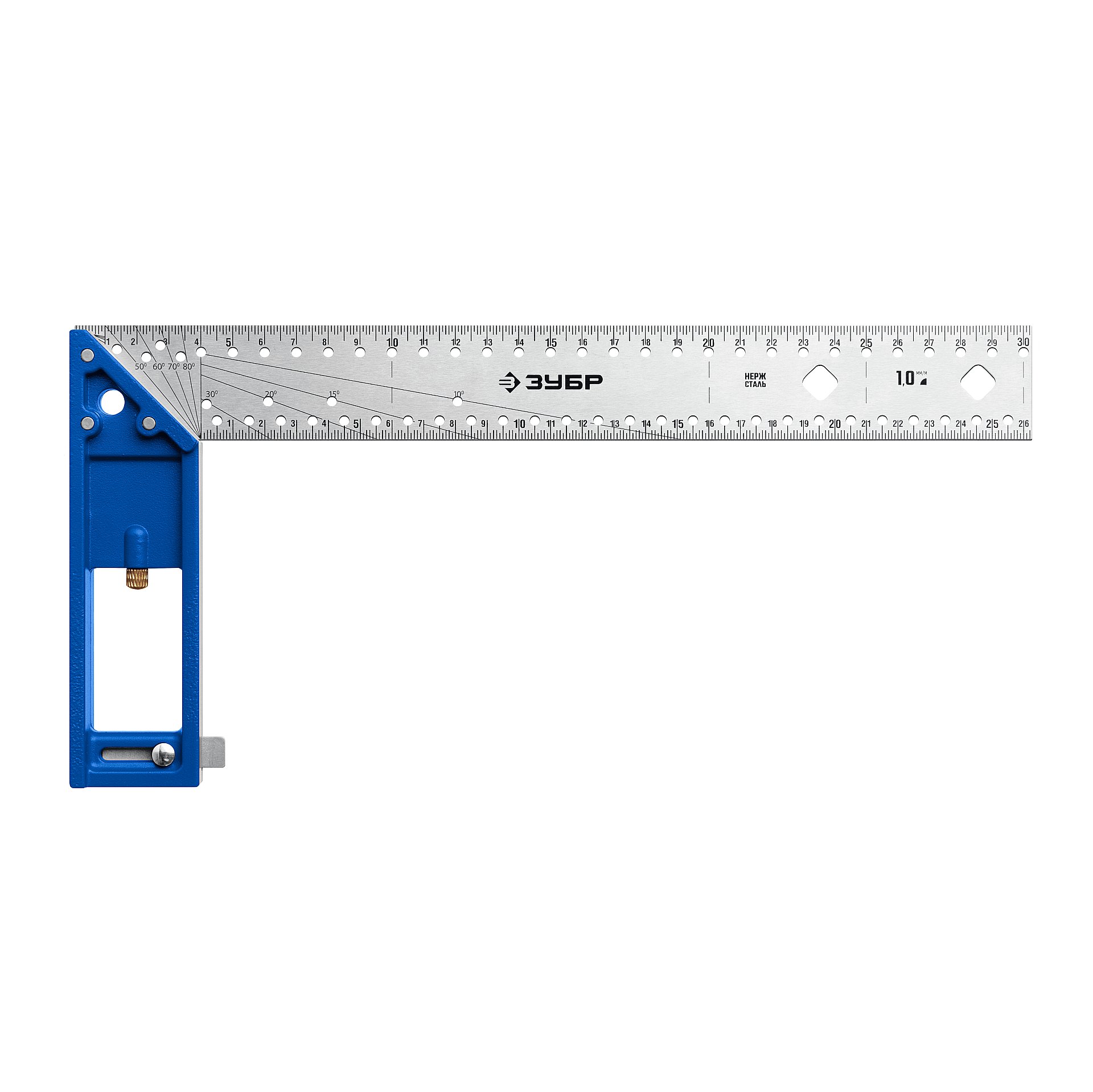 - Отверстия для разметки градусов: 10°, 15°, 20°, 30°, 45°, 50°, 60°, 70°, 80°