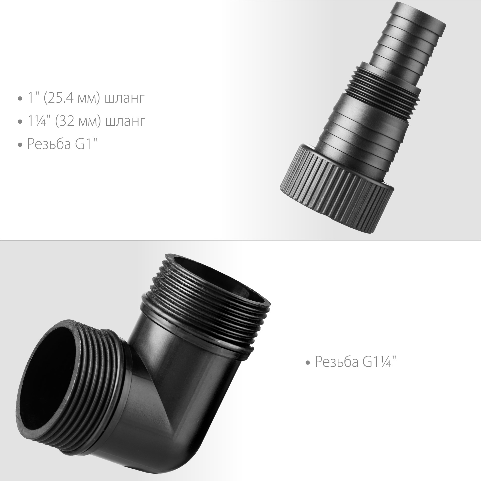 - Универсальный соединительный штуцер от 1'' до 1 1/4'' для шлангов и от G1″ до G1 1/4″ для трубопроводов