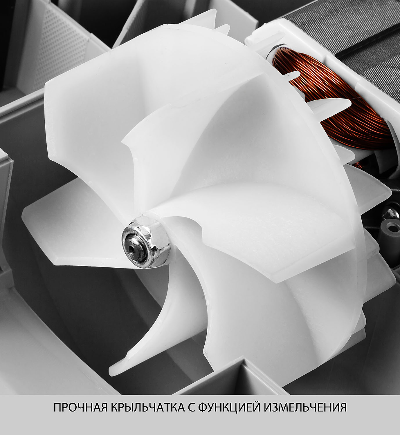 - Перемалывание поступающего в мешок мусора с коэффициентом измельчения 10:1 уменьшает его объем и превращает в полезную мульчу