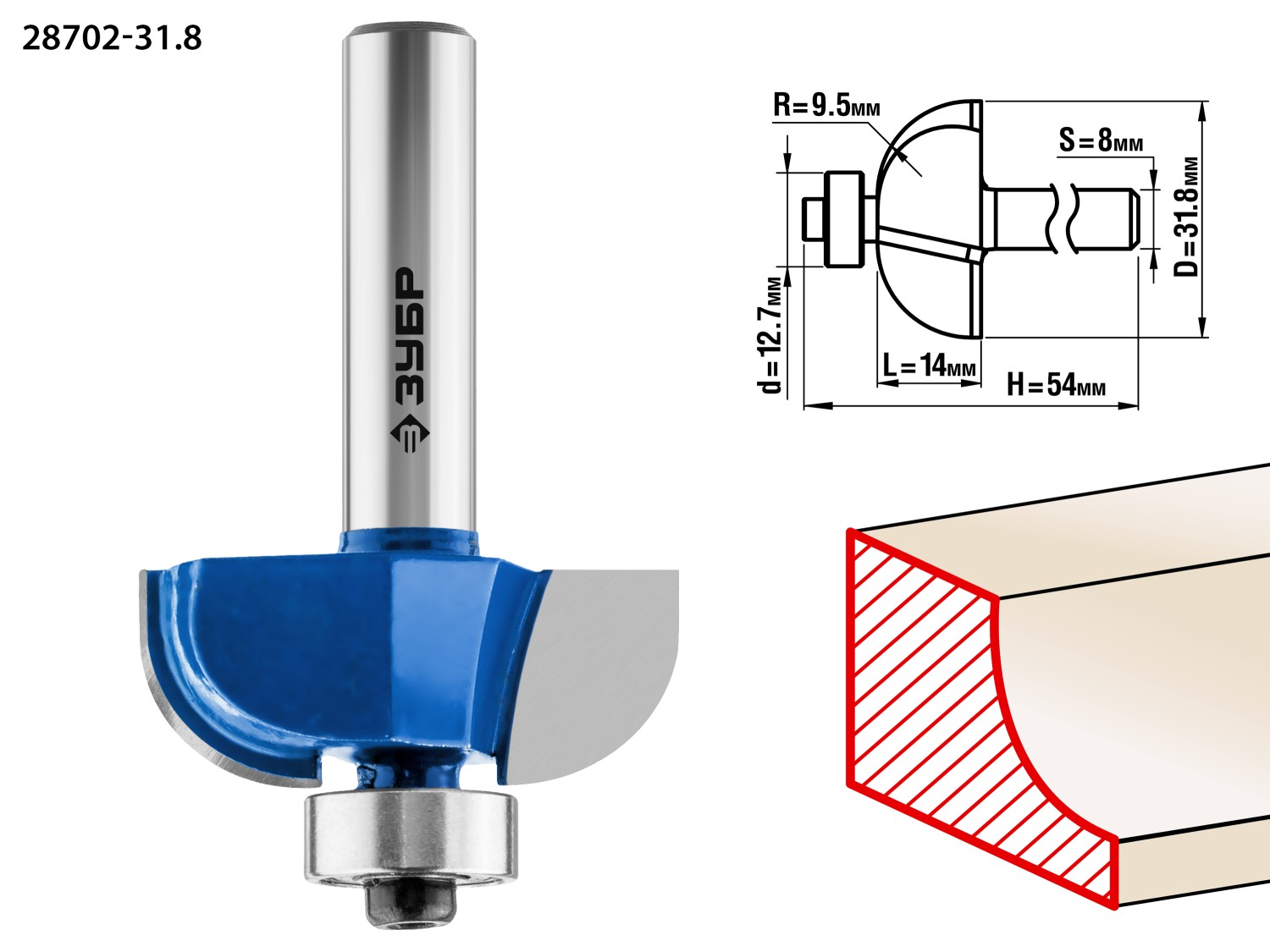 ЗУБР 31.8 x 14 мм, радиус 9.5 мм, фреза кромочная калевочная №2, Профессионал (28702-31.8)