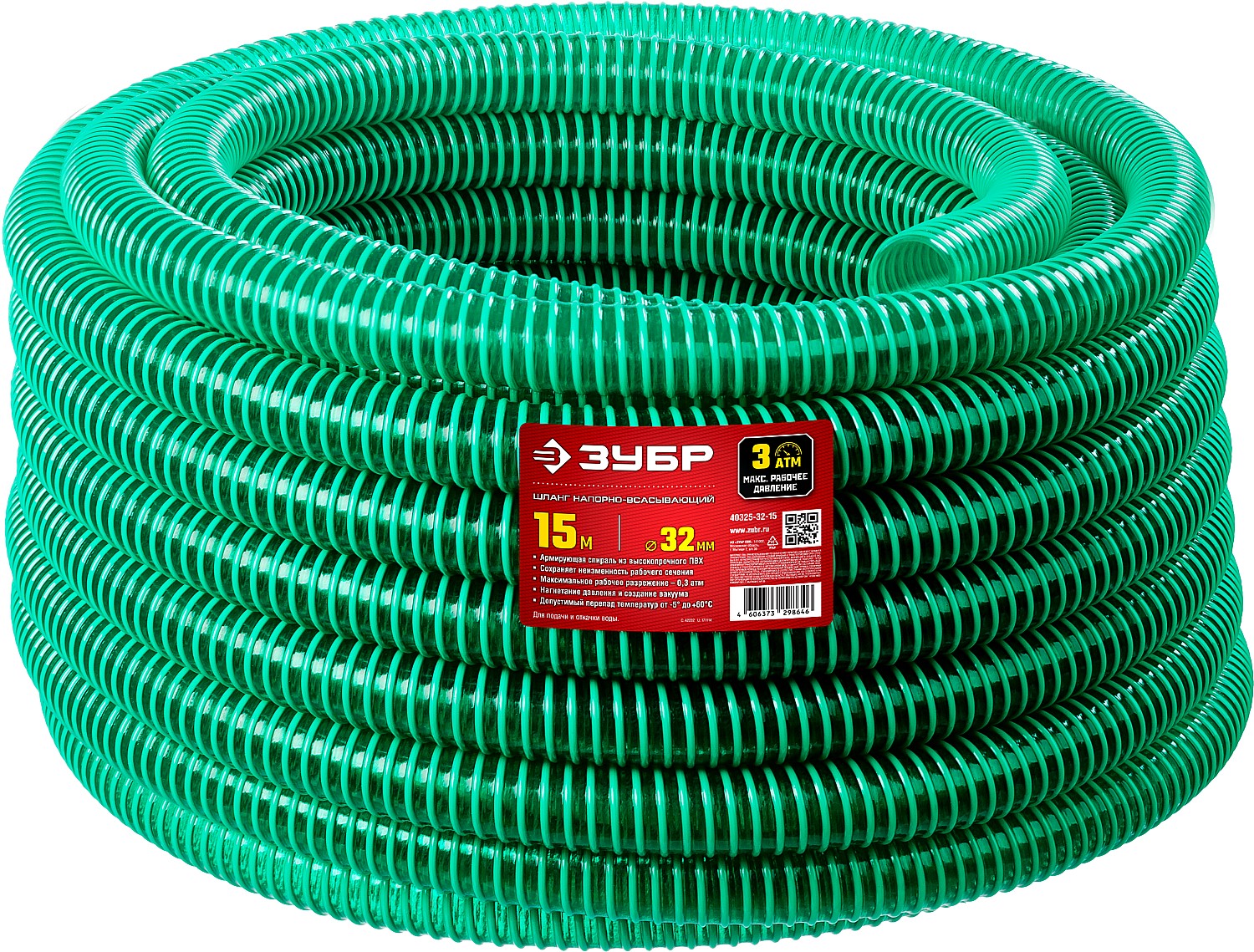 ЗУБР 32 мм x 15 м, 3 атм, со спиралью ПВХ, напорно-всасывающий шланг (40325-32-15)
