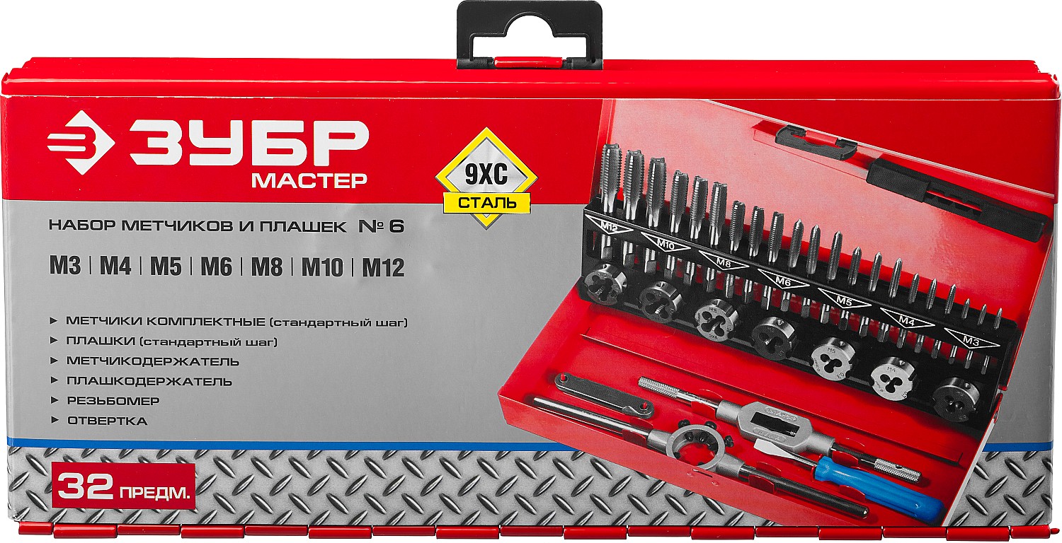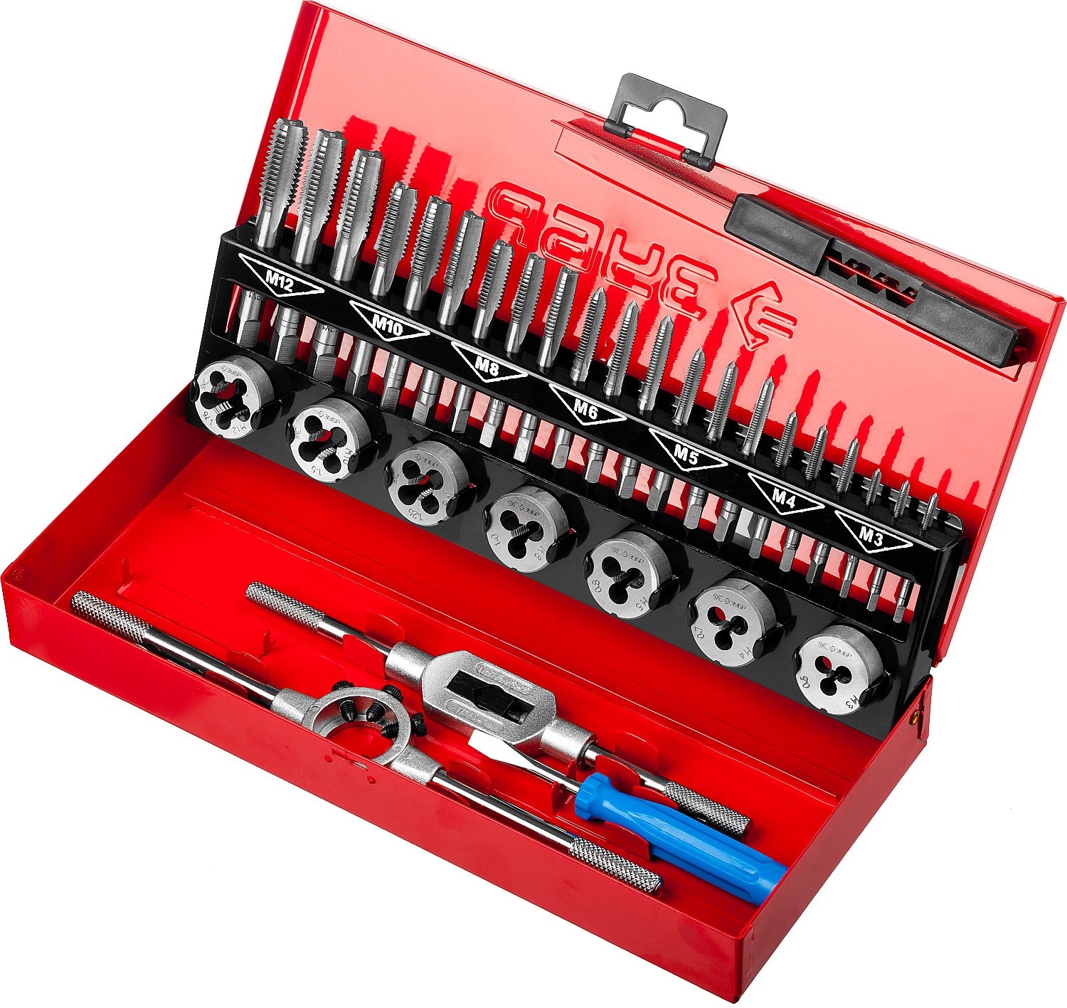 Набор предназначен для резьбонарезных работ в конструкциях и заготовках из сталей и цветных металлов. Метчики ручные однопроходные используются для нарезания внутренней метрической резьбы с нормальным и мелким шагом в глухих и сквозных отверстиях. . Плашки предназначены для нарезания внешней метрической резьбы с нормальным и мелким шагом. Метчикодержатель предназначен для надежного закрепления метчиков Плашкодержатель используется для закрепления плашек при проведении резьбонарезных работ