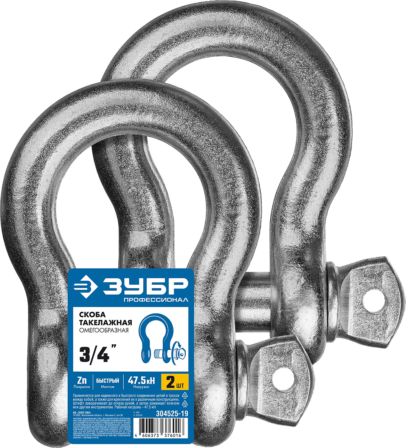 ЗУБР 3/4″ (19.0 мм), 2 шт, палец 22 мм, г/п 4.75 тн, цинк, омегообразная скоба, Профессионал (304525-19)