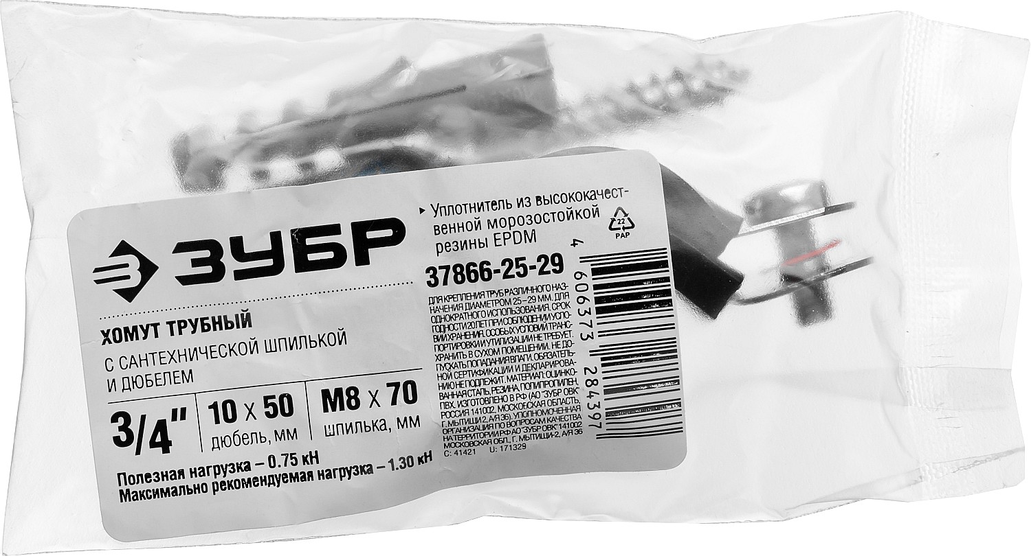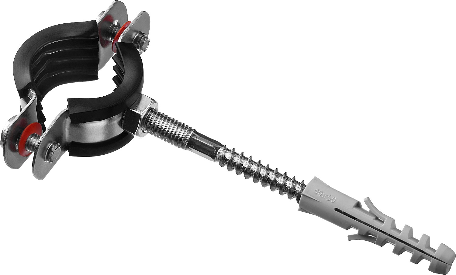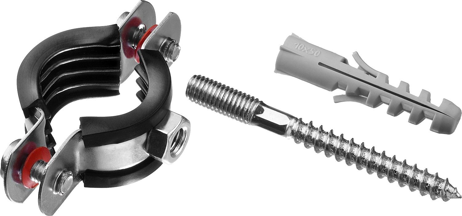 - Комплектность набора позволяет крепить хомут как с помощью гайки, так и с использованием шпильки и дюбеля