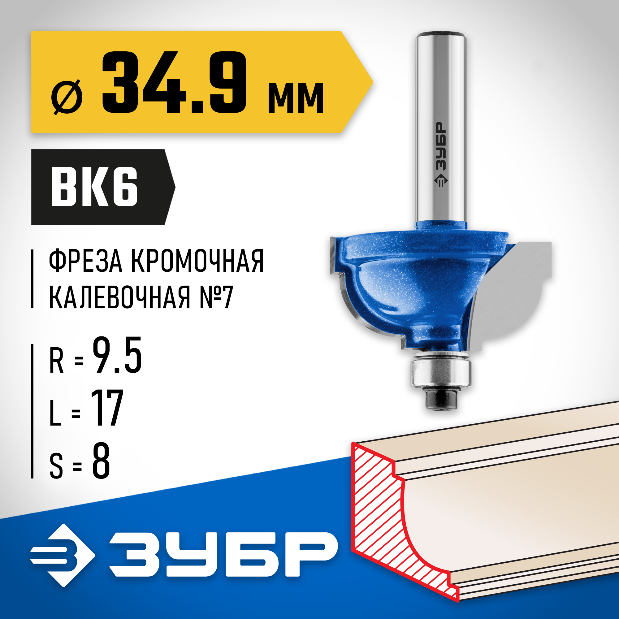 ЗУБР 34.9 x 19 мм, радиус 9.5 мм, фреза кромочная калевочная №7, Профессионал (28709-34.9)