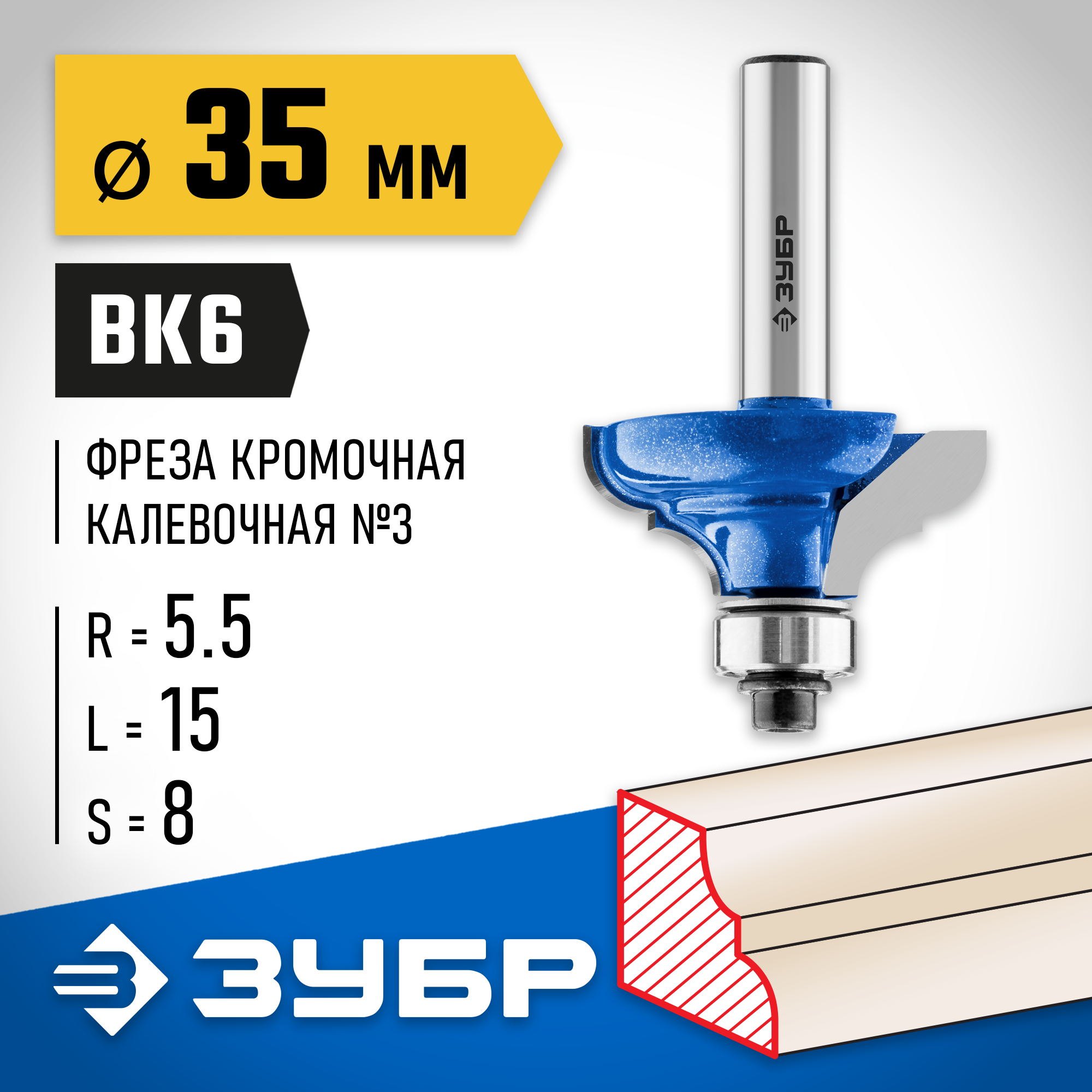 ЗУБР 35 x 17 мм, радиус 5.5 мм, фреза кромочная калевочная №3, Профессионал (28703-35)
