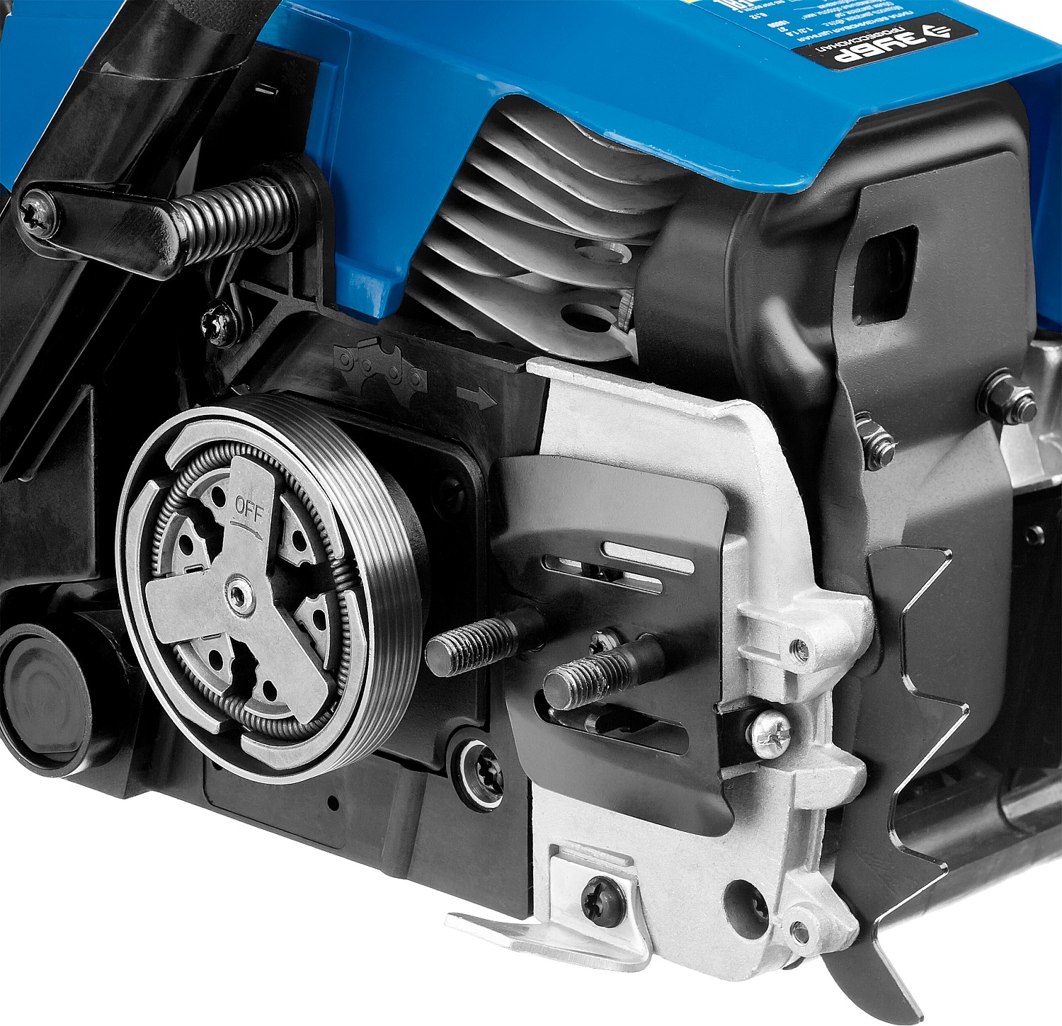 Идеальный вариант для пиления досок, бруса, стволов различных пород дерева на дачном участке. В отличие от электрической, бензиновая пила оснащена более мощным двигателем, безопасна в отношении поражения электрическим током, может работать в любую погоду и в любом месте. Функции легкого запуска, автоматической смазки цепи и эффективная антивибрационная защита делают пилу легкой в обращении и комфортной в работе. Двойной тормоз цепи, приводимый в действие при откидывании защитного щитка или при отпускании клавиши блокировки на рукоятке, а также встроенный цепеуловитель и металлический упор делают пилу безопасной в применении. Большая удельная мощность, высокое качество применяемых материалов и изготовления, обеспечивающие увеличенный ресурс, делают бензиновую пилу ЗУБР Вашим лучшим помощником