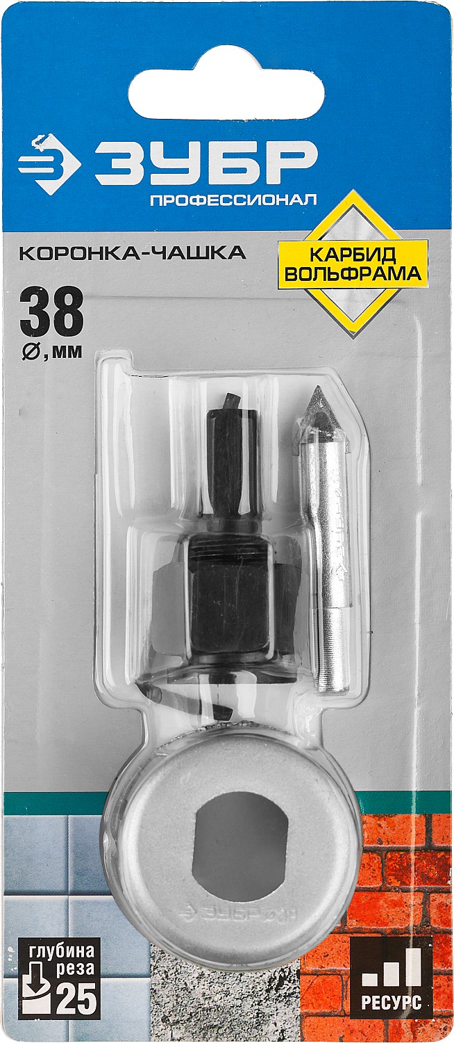 ЗУБР 38 мм, L 25 мм, карбид вольфрама, коронка-чашка с державкой и сверлом, Профессионал (33360-038)