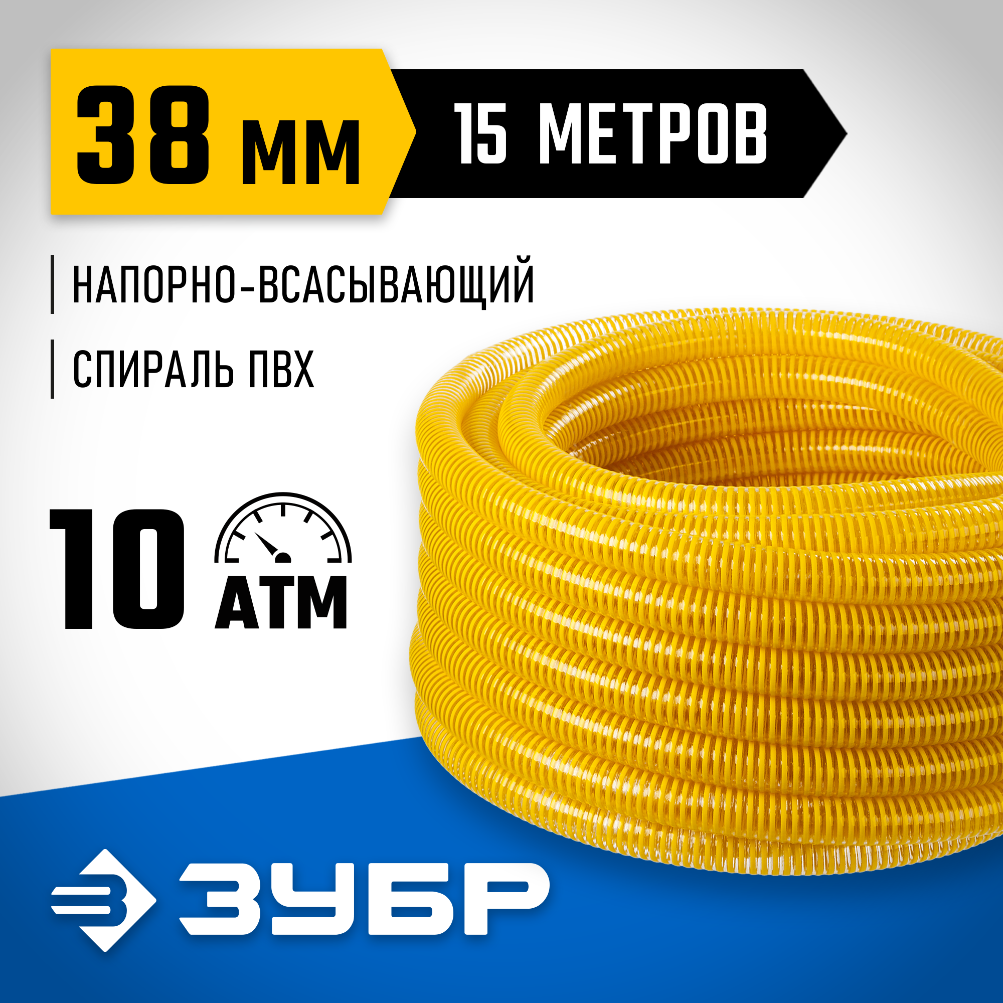 ЗУБР 38 мм x 15 м, 10 атм, со спиралью ПВХ, напорно-всасывающий шланг, ПРОФЕССИОНАЛ (40327-38-15)