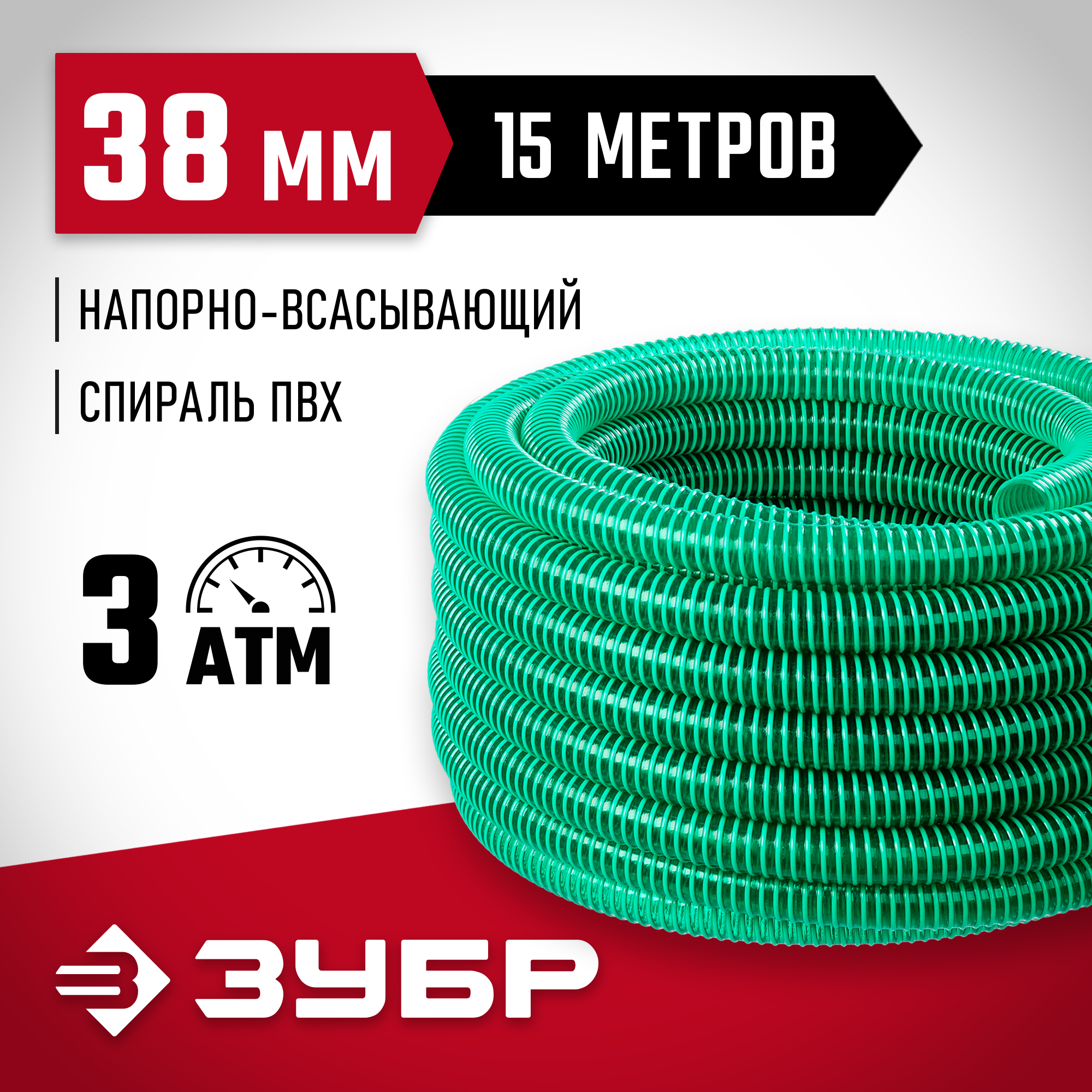 ЗУБР 38 мм x 15 м, 3 атм, со спиралью ПВХ, напорно-всасывающий шланг (40325-38-15)