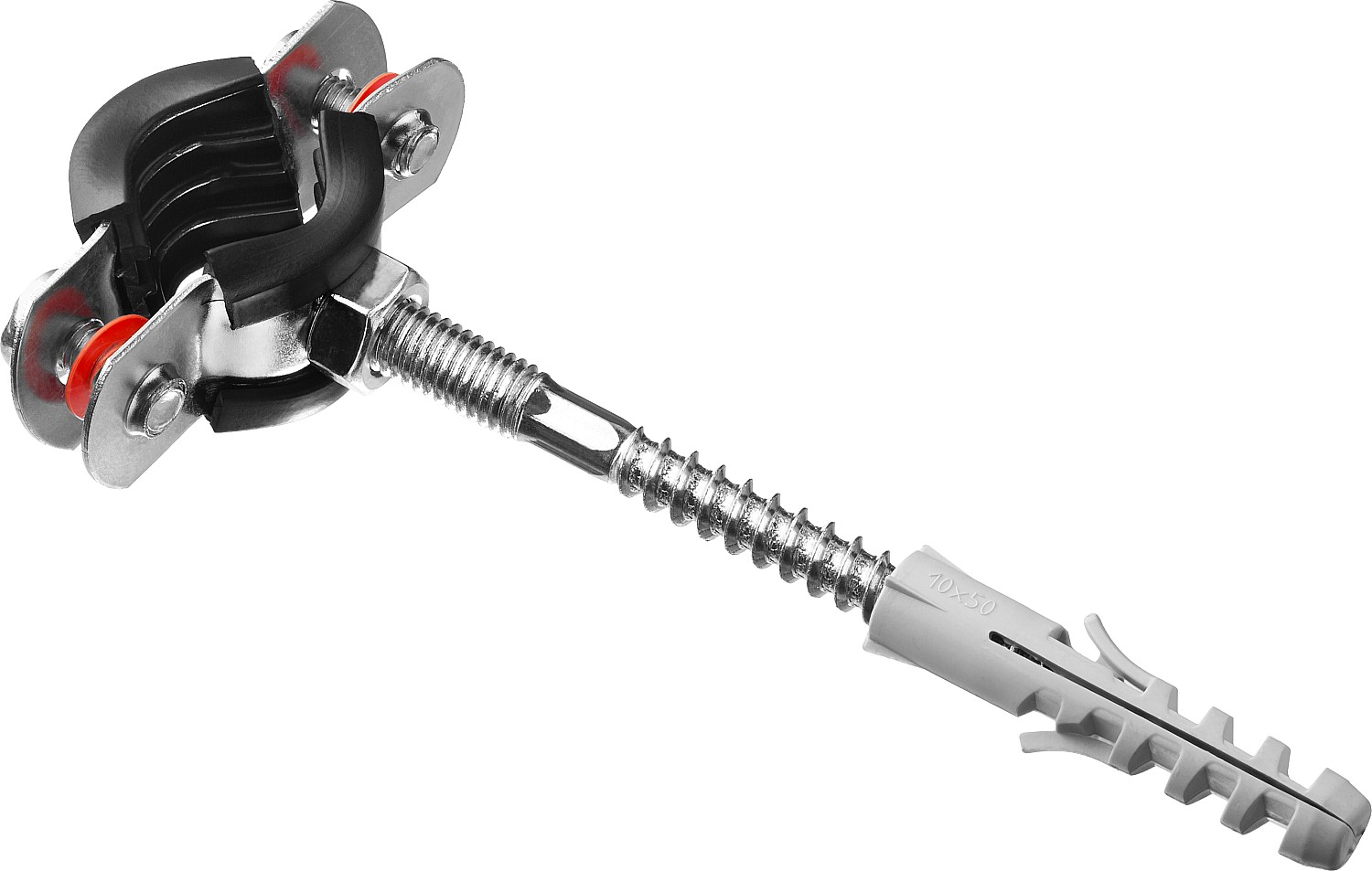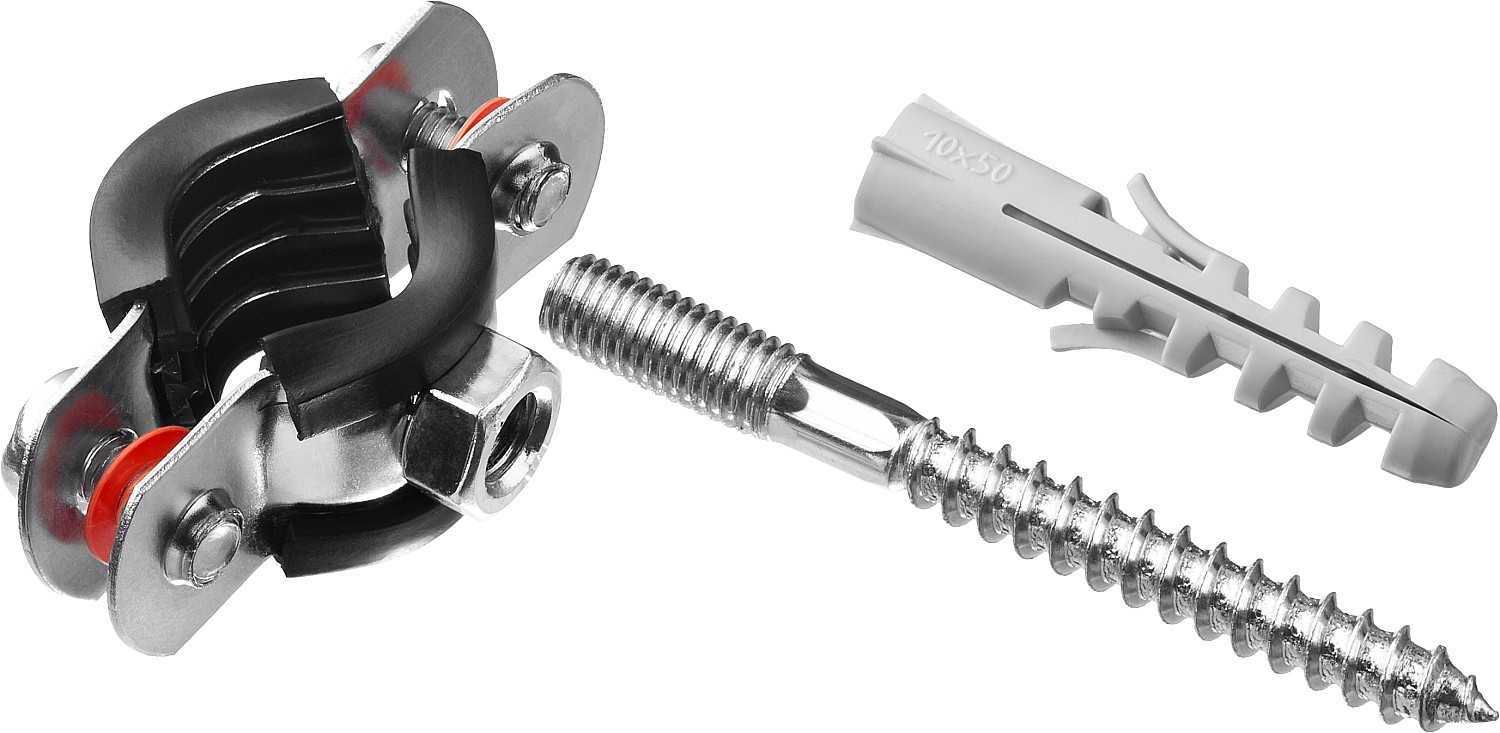 - Комплектность набора позволяет крепить хомут как с помощью гайки, так и с использованием шпильки и дюбеля