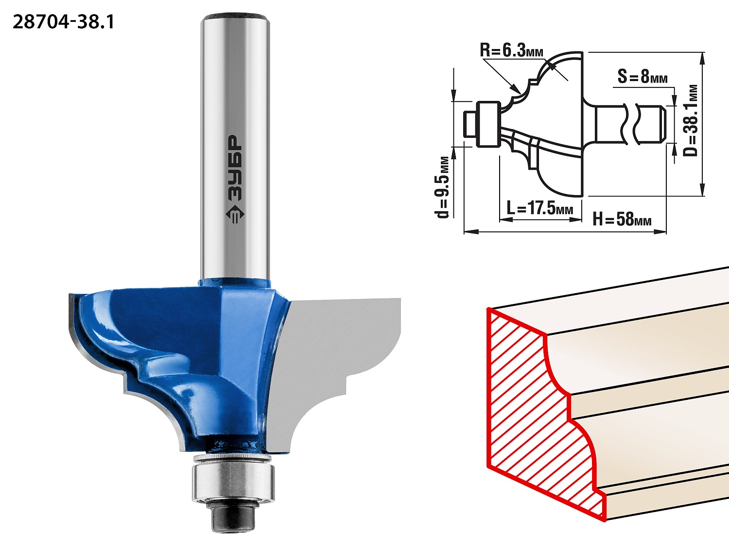 ЗУБР 38.1 x 17.5 мм, радиус 6.3 мм, фреза кромочная калевочная №3, Профессионал (28704-38.1)