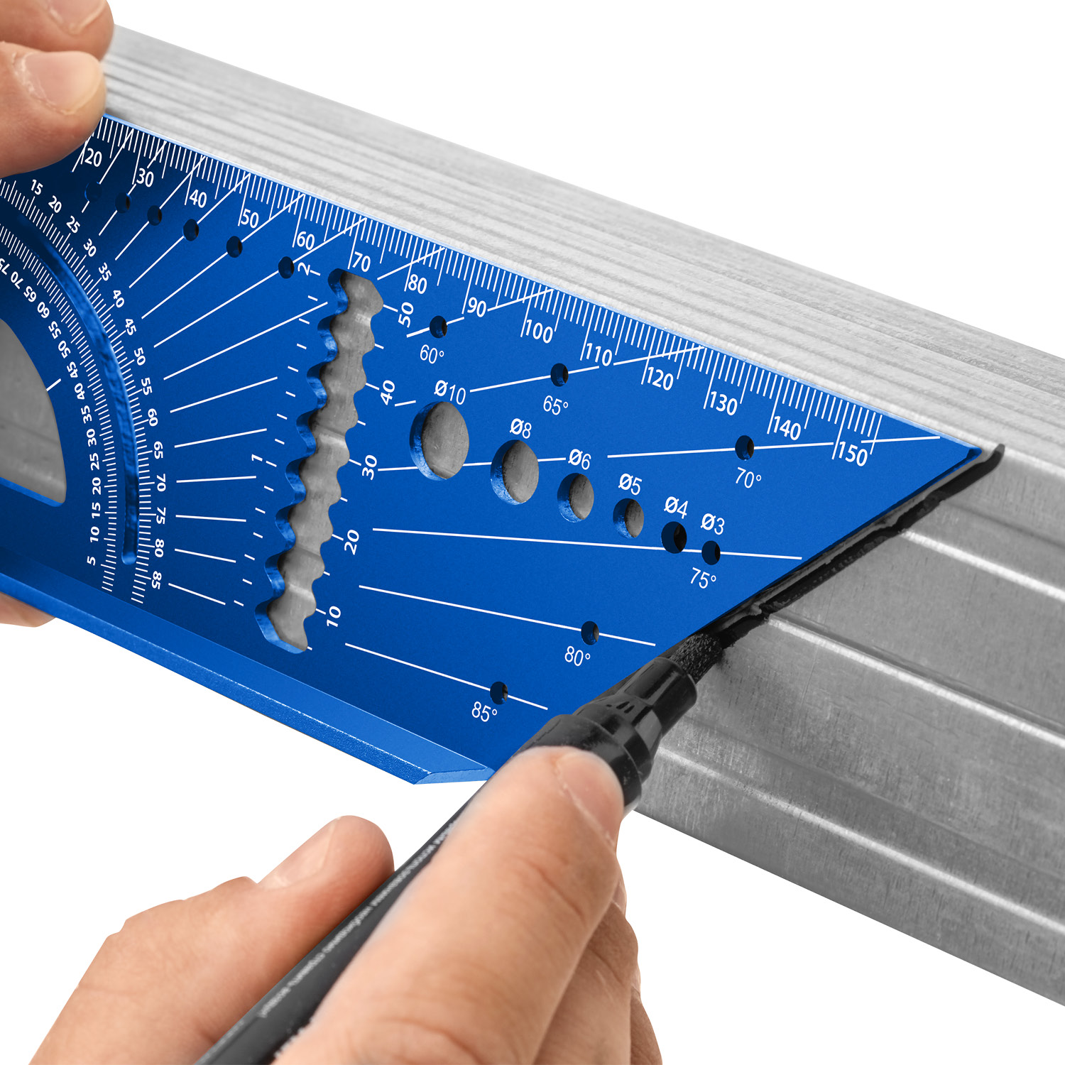 Профессиональный универсальный кровельный угольник инструмент для точной разметки объёмных конструкций, таких кк трубы, балки, направляющие. Имеет широкую область применения: разметка под углом 90 градусов, разметка под углом 45 градусов, разметка труб, рейсмус, транспортир, линейная разметка, определение размера сверла.