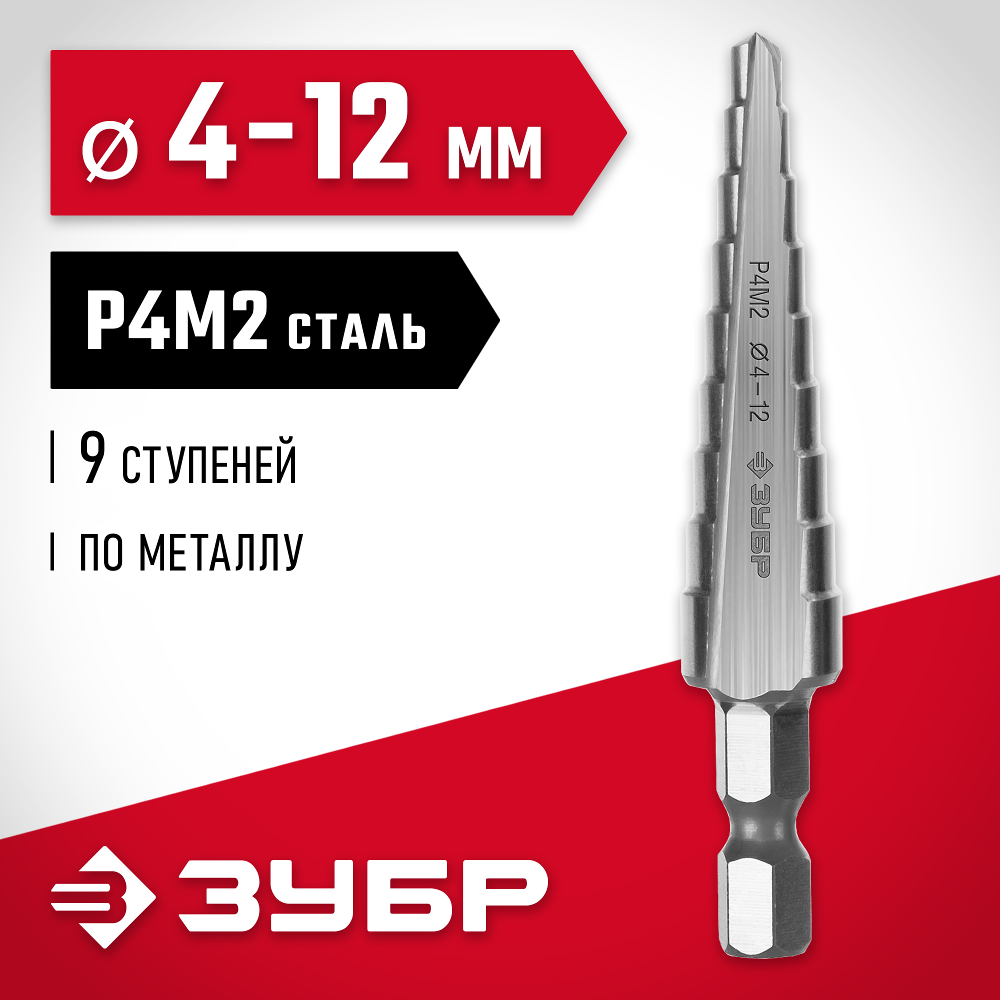 ЗУБР 4-12 мм, 9 ступеней, сталь Р4М2, ступенчатое сверло (29665-4-12-9)