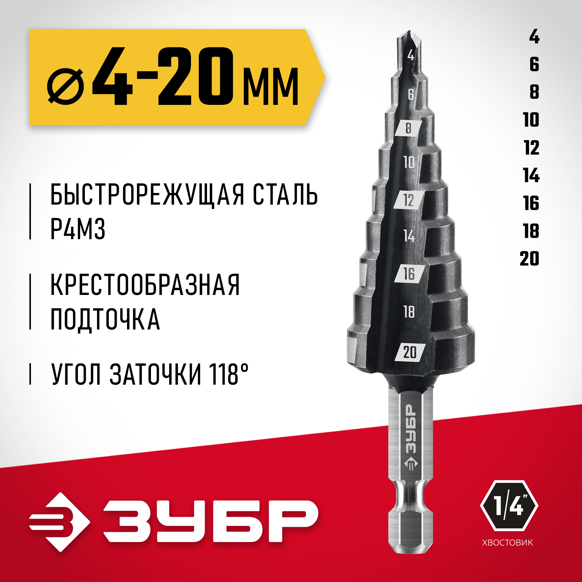 ЗУБР 4-20мм, 9 ступеней, сверло ступенчатое(29665-4-20-9)
