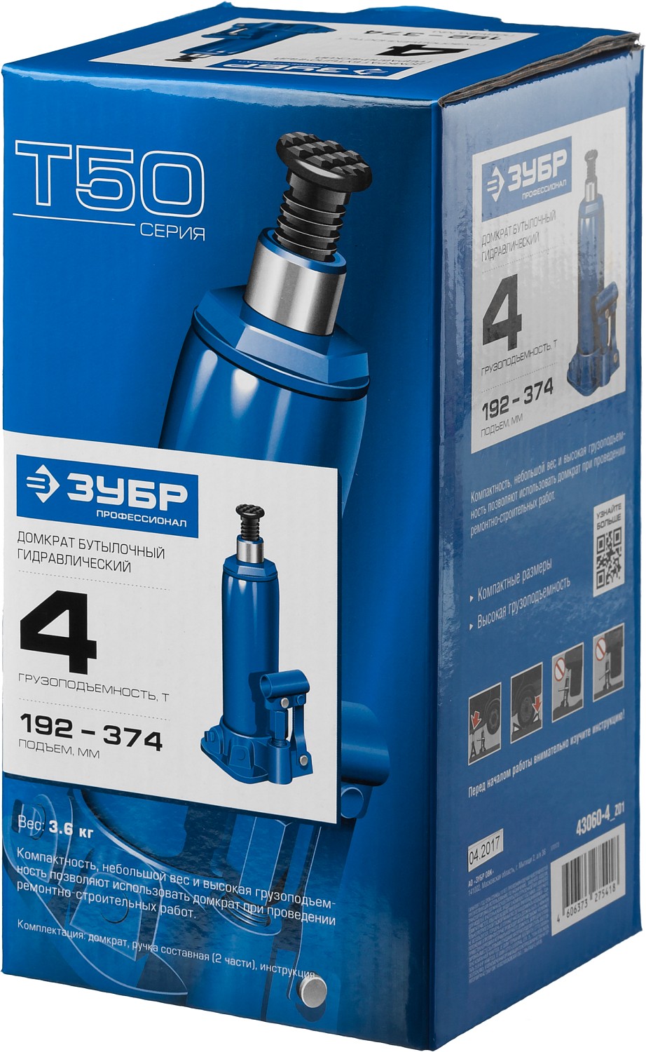 ЗУБР 4 т, 192 - 374 мм, бутылочный гидравлический домкрат, Профессионал (43060-4)