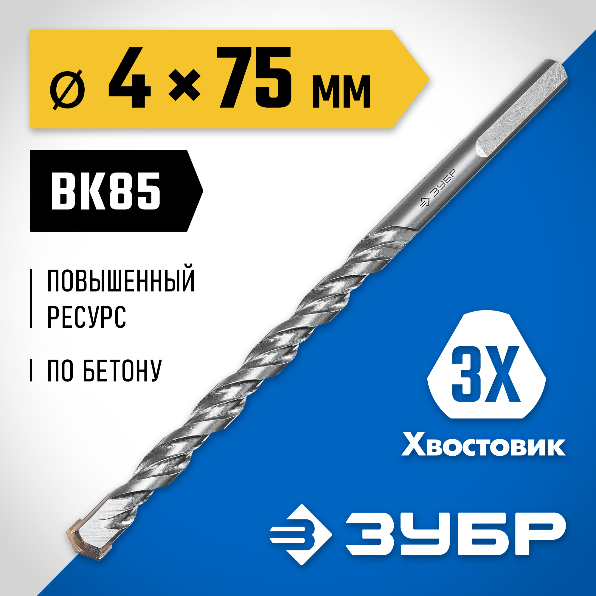 ЗУБР 4 x 75 мм, трехгранный хвостовик, сверло по бетону усиленное, Профессионал (2916-075-04)